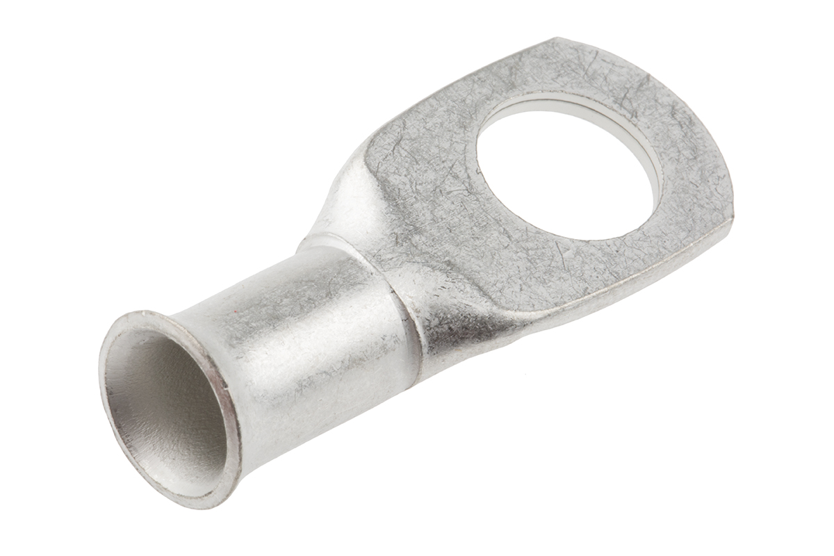 This is Uninsulated Tin Plated Tubular Ring Terminal 10mm Stud Size 25mm² to 25mm² manufactured by RS Pro. The manufacturer part number is 841-7627. It is supplied as unshrouded. The wire has a maximum size of 25mm². It has a decent natural colour. While the minimum wire size AWG includes 4awg. It is 1.2mm thick. It has a standard 10mm size stud . In addition, its outlet ring diameter is about 9.1mm . Moreover, the inner ring is about 6.7mm in diameter . It has a robust copper insulation material. The high-quality tin is used as contact plating material. It has an overall length of 36.9mm. Insulation Option: uninsulated. Its maximum wires size includes 4awg. On the other hand, the wire has 25mm² of minimum size. It has a maximum operating temperature of +120°c. Whereas, the minimum operating temperature of the product is -30°c. The product is made from sturdy copper materials.