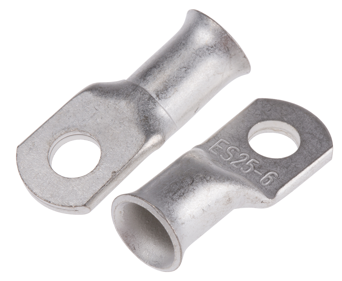 This is Uninsulated Tin Plated Tubular Ring Terminal 6mm Stud Size 25mm² to 25mm² manufactured by RS Pro. The manufacturer part number is 841-7620. It is supplied as unshrouded. The wire has a maximum size of 25mm². It has a decent natural colour. While the minimum wire size AWG includes 4awg. It is 1.2mm thick. It has a standard 6mm size stud . In addition, its outlet ring diameter is about 9.1mm . Moreover, the inner ring is about 6.7mm in diameter . It has a robust copper insulation material. The high-quality tin is used as contact plating material. It has an overall length of 32.2mm. Insulation Option: uninsulated. Its maximum wires size includes 4awg. On the other hand, the wire has 25mm² of minimum size. It has a maximum operating temperature of +120°c. Whereas, the minimum operating temperature of the product is -30°c. The product is made from sturdy copper materials.