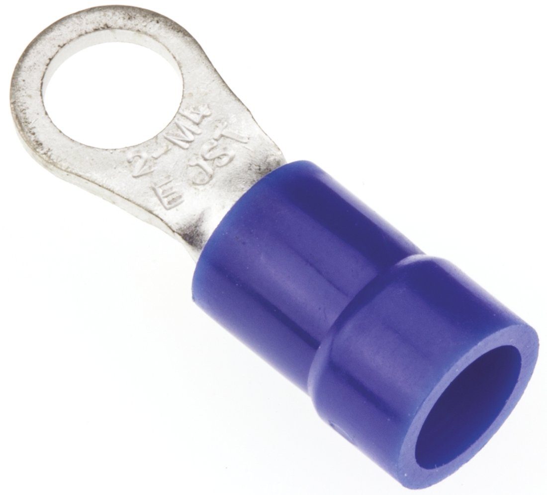 This is R Series Insulated Crimp Ring Terminal 4mm Stud Size 1mm² to 2.6mm² 16AWG to 14AWG Blue manufactured by JST. The manufacturer part number is FN2-M4. The wire has a maximum size of 2.6mm². The product r, is a highly preferred choice for users. It has a decent blue colour. While the minimum wire size AWG includes 16awg. It is 0.8mm thick. It has a standard 4mm size stud . Moreover, the inner ring is about 4.3mm in diameter . It has a robust nylon insulation material. It has an overall length of 18.6mm. Insulation Option: insulated. Its maximum wires size includes 14awg. On the other hand, the wire has 1mm² of minimum size. In addition, its outlet ring diameter is about 6.6mm .