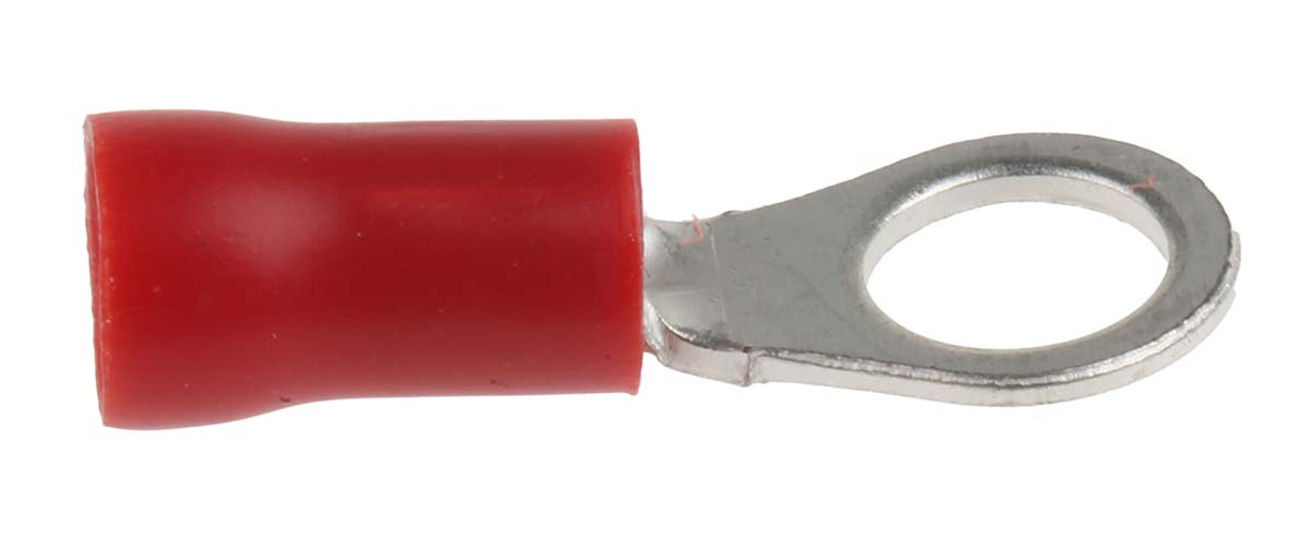This is Insulated Tin Plated Crimp Ring Terminal M5 Stud Size 0.5mm² to 1.5mm² 22AWG to 16AWG Red manufactured by RS Pro. The manufacturer part number is 534-200. The wire has a maximum size of 1.5mm². It has a decent red colour. While the minimum wire size AWG includes 22awg. It is 0.8mm thick. It has a standard m5 size stud . In addition, its outlet ring diameter is about 8mm . Moreover, the inner ring is about 5.3mm in diameter . It has a robust pvc insulation material. The high-quality tin is used as contact plating material. It has an overall length of 26.7mm. Insulation Option: insulated. Its maximum wires size includes 16awg. On the other hand, the wire has 0.5mm² of minimum size. It has a maximum operating temperature of +75°c. The product is made from sturdy copper materials.