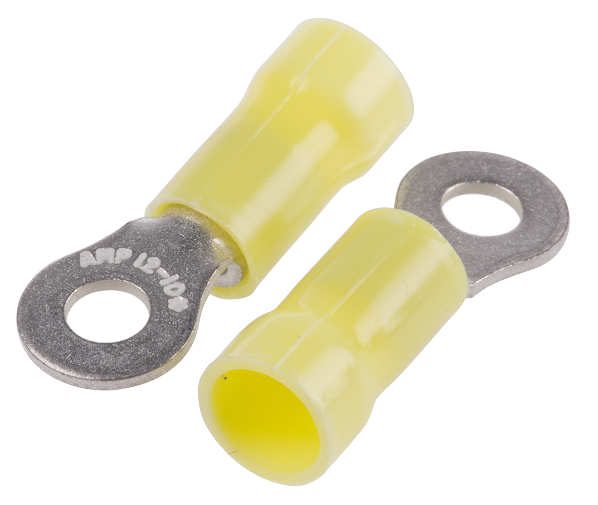 This is PLASTI-GRIP Series Insulated Tin Plated Crimp Ring Terminal M4 Stud Size 2.6mm² to 6.6mm² 12AWG manufactured by TE Connectivity. The manufacturer part number is 34853. The wire has a maximum size of 6.6mm². The high-quality tin is used as contact plating material. The product plasti-grip, is a highly preferred choice for users. It has a decent yellow colour. While the minimum wire size AWG includes 12awg. It has a standard m4 size stud . In addition, its outlet ring diameter is about 9.52mm . Moreover, the inner ring is about 4.34mm in diameter . It has a robust vinyl insulation material. It has an overall length of 27.89mm. Insulation Option: insulated. Its maximum wires size includes 10awg. On the other hand, the wire has 2.6mm² of minimum size. The product is made from sturdy copper materials.