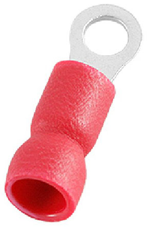 This is Insulated Crimp Ring Terminal M3.2 (#4) Stud Size 0.5mm² to 1.5mm² 22AWG to 16AWG Red manufactured by RS Pro. The manufacturer part number is 125-1955. The wire has a maximum size of 1.5mm². The high-quality tin is used as contact plating material. It has a decent red colour. While the minimum wire size AWG includes 22awg. It is 0.75mm thick. It has a standard m3.2 size stud . In addition, its outlet ring diameter is about 5.5mm . Moreover, the inner ring is about 3.2mm in diameter . It has a robust vinyl insulation material. It has an overall length of 18.7mm. Insulation Option: insulated. Its maximum wires size includes 16awg. On the other hand, the wire has 0.5mm² of minimum size. It has a maximum operating temperature of +105°c. Whereas, the minimum operating temperature of the product is -40°c. The product is made from sturdy copper materials.