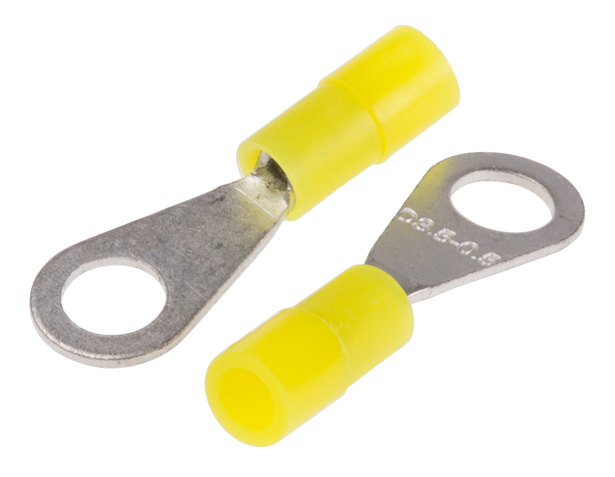 This is Insulated Tin Plated Crimp Ring Terminal M3.5 Stud Size 0.2mm² to 0.5mm² 26AWG to 22AWG Yellow manufactured by RS Pro. The manufacturer part number is 239-4127. The wire has a maximum size of 0.5mm². It has a decent yellow colour. While the minimum wire size AWG includes 26awg. It has a standard m3.5 size stud . In addition, its outlet ring diameter is about 6mm . Moreover, the inner ring is about 3.7mm in diameter . It has a robust nylon insulation material. The high-quality tin is used as contact plating material. It has an overall length of 19mm. Insulation Option: insulated. Its maximum wires size includes 22awg. On the other hand, the wire has 0.2mm² of minimum size. The product is made from sturdy copper materials.