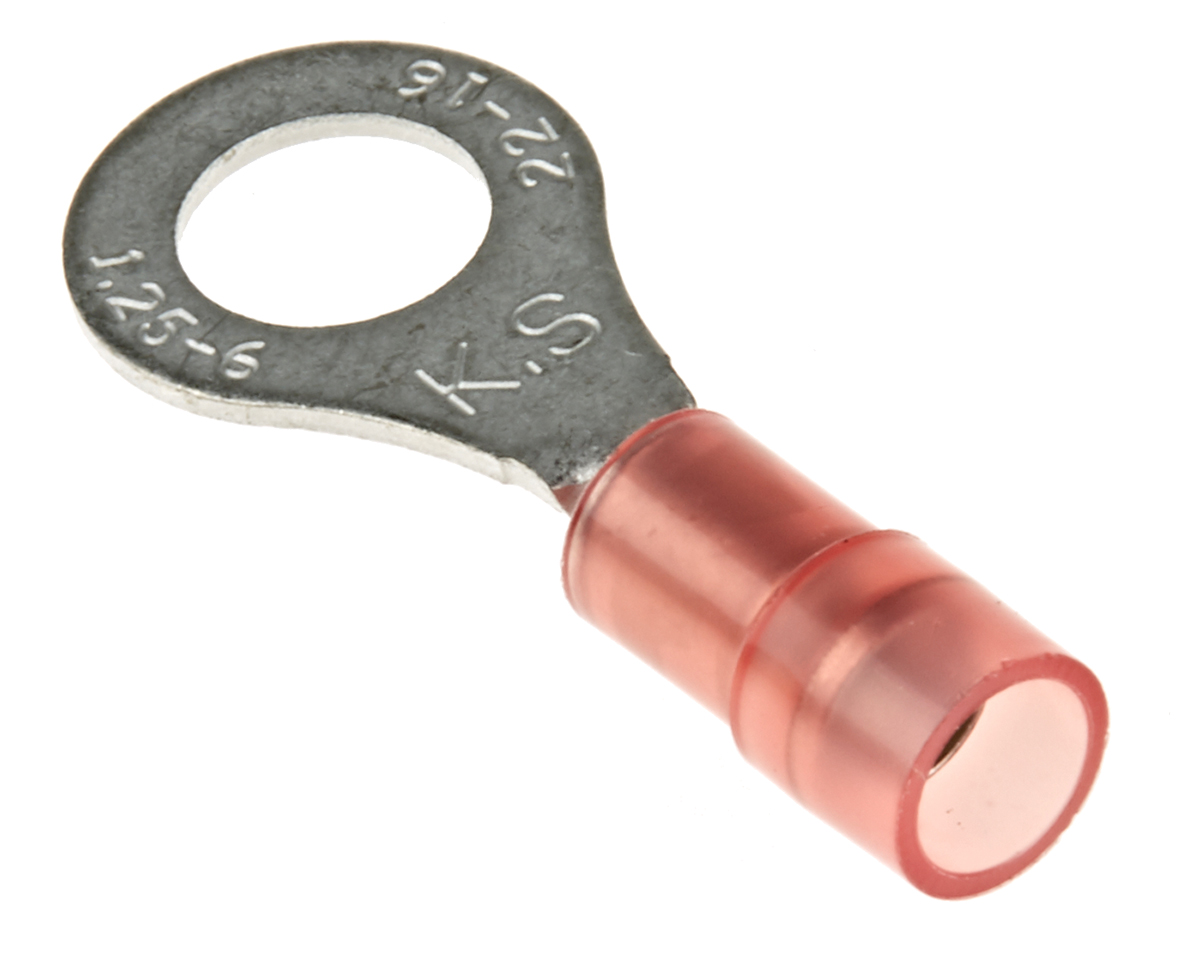 This is RNYD Series Insulated Crimp Ring Terminal M6 (1/4) Stud Size 0.5mm² to 1.5mm² 22AWG to 16AWG Red manufactured by RS Pro. The manufacturer part number is 267-3593. The wire has a maximum size of 1.5mm². It has a decent red colour. While the minimum wire size AWG includes 22awg. It is 0.75mm thick. It has a standard m6 (1/4) size stud . In addition, its outlet ring diameter is about 11.6mm . Moreover, the inner ring is about 6.4mm in diameter . It has a robust nylon insulation material. It has an overall length of 27.8mm. Insulation Option: insulated. Its maximum wires size includes 16awg. On the other hand, the wire has 0.5mm² of minimum size. The product is made from sturdy copper materials.