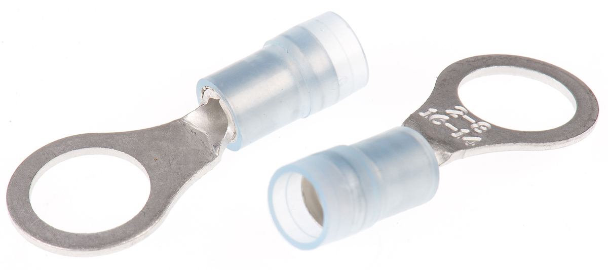 This is RNYD Series Insulated Crimp Ring Terminal M8 (5/16) Stud Size 1.5mm² to 2.5mm² 16AWG to 14AWG Blue manufactured by RS Pro. The manufacturer part number is 267-3723. The wire has a maximum size of 2.5mm². It has a decent blue colour. While the minimum wire size AWG includes 16awg. It is 0.8mm thick. It has a standard m8 (5/16) size stud . In addition, its outlet ring diameter is about 12mm . Moreover, the inner ring is about 8.4mm in diameter . It has a robust nylon insulation material. It has an overall length of 27.8mm. Insulation Option: insulated. Its maximum wires size includes 14awg. On the other hand, the wire has 1.5mm² of minimum size. The product is made from sturdy copper materials.