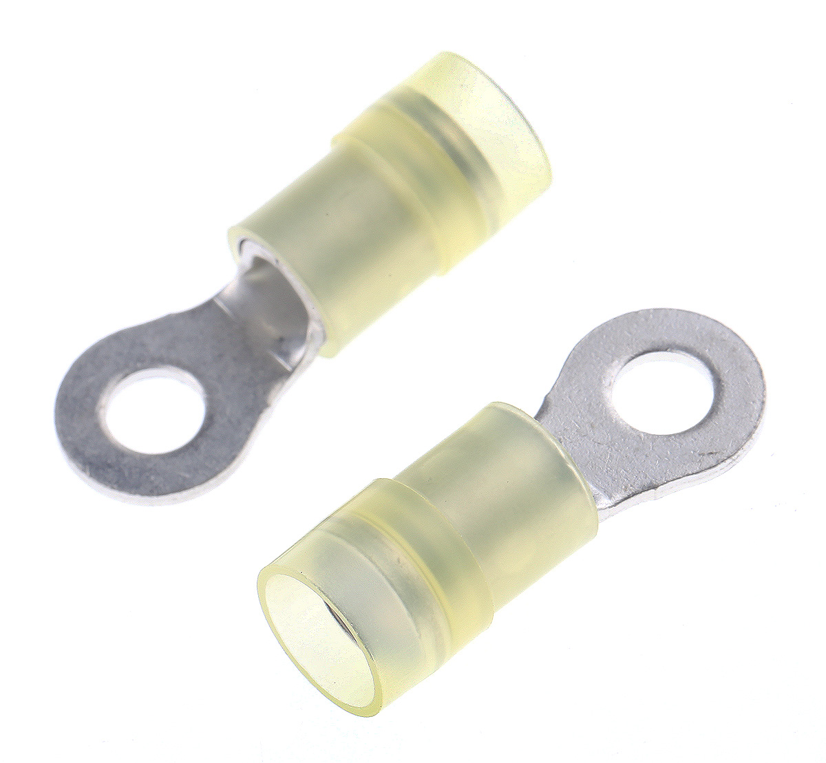 This is RNYD Series Insulated Crimp Ring Terminal M4.5 (#8) Stud Size 4mm² to 6mm² 12AWG to 10AWG Yellow manufactured by RS Pro. The manufacturer part number is 267-3896. The wire has a maximum size of 6mm². It has a decent yellow colour. While the minimum wire size AWG includes 12awg. It is 1mm thick. It has a standard m4.5 (#8) size stud . In addition, its outlet ring diameter is about 9.5mm . Moreover, the inner ring is about 4.3mm in diameter . It has a robust nylon insulation material. It has an overall length of 26mm. Insulation Option: insulated. Its maximum wires size includes 10awg. On the other hand, the wire has 4mm² of minimum size. The product is made from sturdy copper materials.