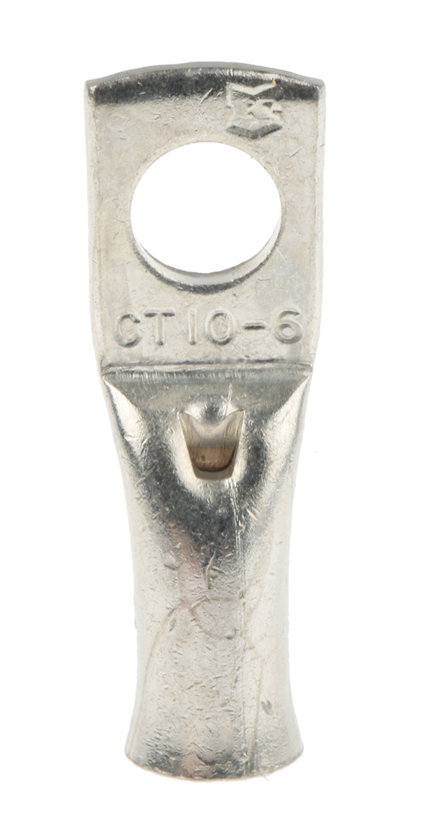 This is CT Series Uninsulated Tin Plated Tubular Ring Terminal M6 Stud Size 10mm² to 10mm² manufactured by RS Pro. The manufacturer part number is 531-021. The wire has a maximum size of 10mm². It has a standard m6 size stud . Moreover, the inner ring is about 6.4mm in diameter . The high-quality tin is used as contact plating material. It has an overall length of 30mm. Insulation Option: uninsulated. The product is made from sturdy copper materials.