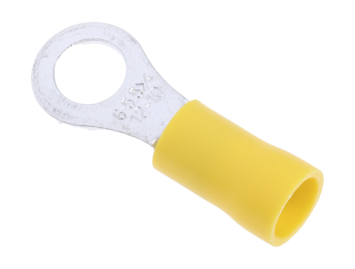 This is Insulated Tin Plated Crimp Ring Terminal M6 Stud Size 2.5mm² to 6mm² 12AWG to 10AWG Yellow manufactured by RS Pro. The manufacturer part number is 534-430. The wire has a maximum size of 6mm². It has a decent yellow colour. While the minimum wire size AWG includes 12awg. It is 1mm thick. It has a standard m6 size stud . In addition, its outlet ring diameter is about 11mm . Moreover, the inner ring is about 6.35mm in diameter . It has a robust pvc insulation material. The high-quality tin is used as contact plating material. It has an overall length of 29mm. Insulation Option: insulated. Its maximum wires size includes 10awg. On the other hand, the wire has 2.5mm² of minimum size. It has a maximum operating temperature of +75°c. The product is made from sturdy copper materials.