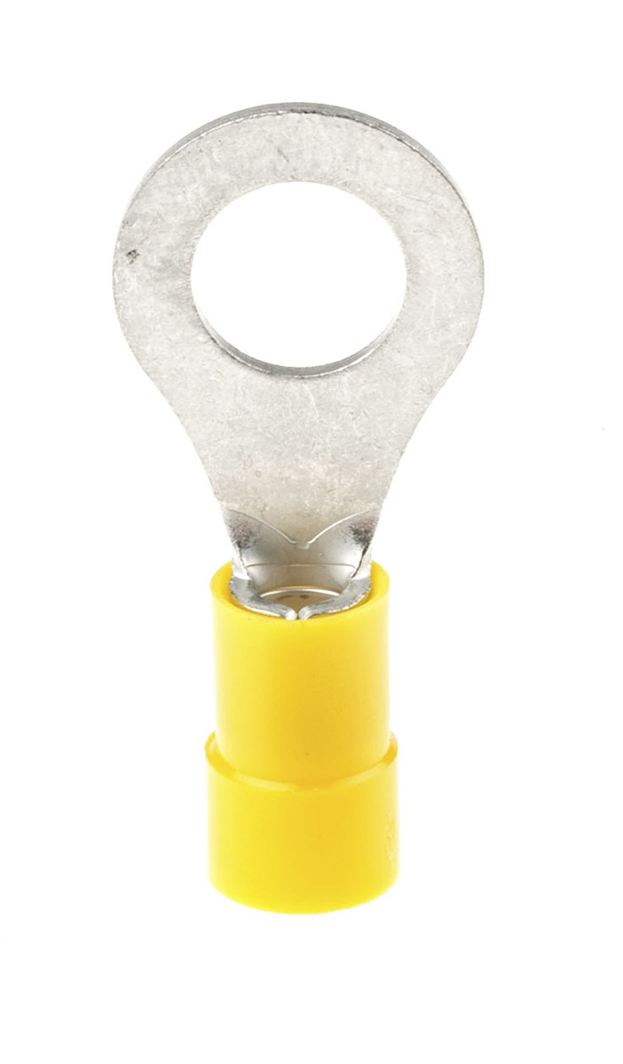 This is Insulated Tin Plated Crimp Ring Terminal M8 Stud Size 4mm² to 6mm² 12AWG to 10AWG Yellow manufactured by RS Pro. The manufacturer part number is 613-9283. The wire has a maximum size of 6mm². It has a decent yellow colour. While the minimum wire size AWG includes 12awg. It is 1mm thick. It has a standard m8 size stud . In addition, its outlet ring diameter is about 15mm . Moreover, the inner ring is about 8.4mm in diameter . It has a robust vinyl insulation material. The high-quality tin is used as contact plating material. It has an overall length of 34mm. Insulation Option: insulated. Its maximum wires size includes 10awg. On the other hand, the wire has 4mm² of minimum size. The product is made from sturdy copper materials.