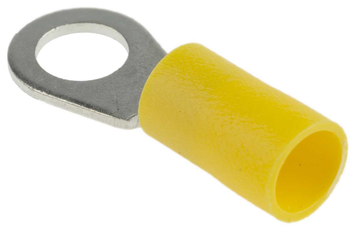 This is Insulated Crimp Ring Terminal 6.5mm Stud Size 2.5mm² to 6mm² Wire Size Yellow manufactured by RS PRO. The manufacturer part number is 178-7268. The wire has a maximum size of 6mm². It has a decent yellow colour. While the minimum wire size AWG includes 12awg. It is 1mm thick. It has a standard 6.5mm size stud . In addition, its outlet ring diameter is about 11mm . Moreover, the inner ring is about 6.5mm in diameter . It has a robust vinyl insulation material. It has an overall length of 22.5mm. Insulation Option: insulated. Its maximum wires size includes 10awg. On the other hand, the wire has 2.5mm² of minimum size. It has a maximum operating temperature of +105°c. The product is made from sturdy copper materials.