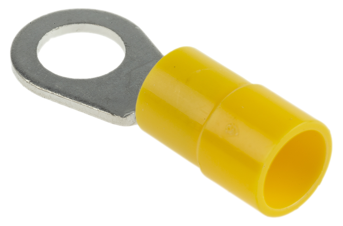 This is Insulated Crimp Ring Terminal 6.5mm Stud Size 2.5mm² to 6mm² Wire Size Yellow manufactured by RS PRO. The manufacturer part number is 178-7276. The wire has a maximum size of 6mm². It has a decent yellow colour. While the minimum wire size AWG includes 12awg. It is 1mm thick. It has a standard 6.5mm size stud . In addition, its outlet ring diameter is about 11mm . Moreover, the inner ring is about 6.5mm in diameter . It has a robust vinyl insulation material. It has an overall length of 23mm. Insulation Option: insulated. Its maximum wires size includes 10awg. On the other hand, the wire has 2.5mm² of minimum size. It has a maximum operating temperature of +105°c. The product is made from sturdy copper materials.