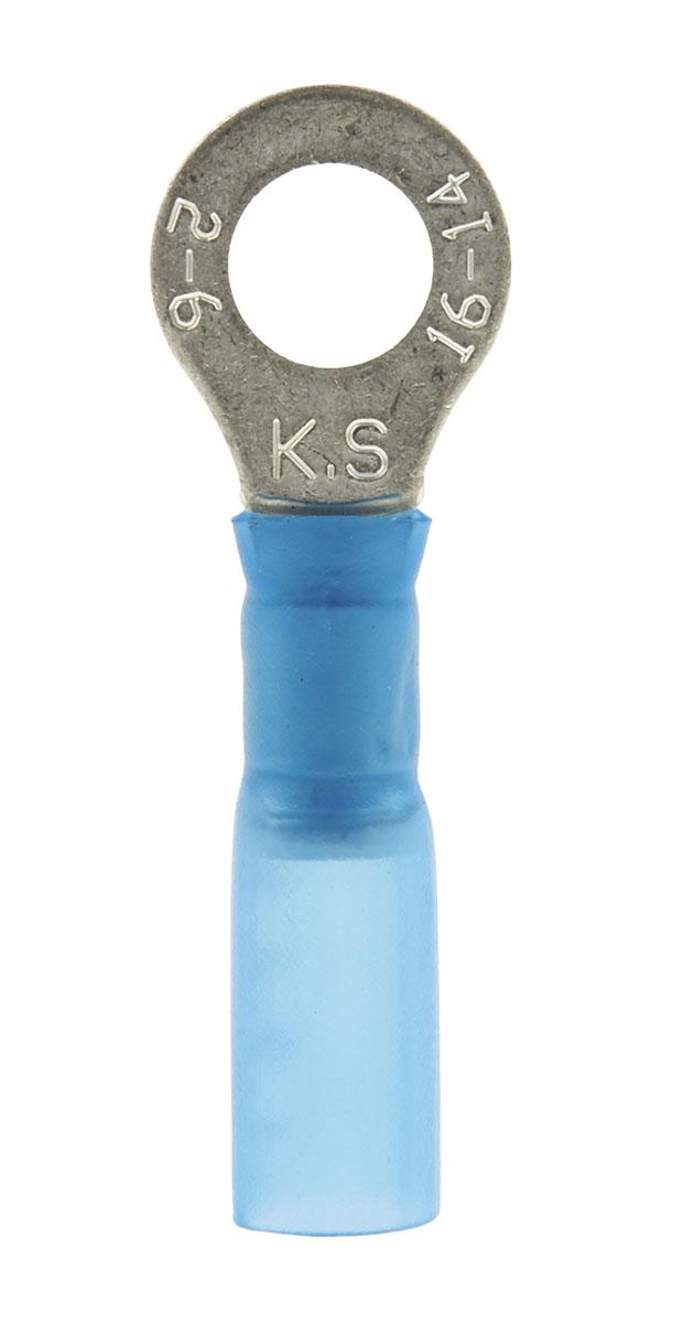 This is HEAT SHRINKABLE-RING TERMINALS "HD" (DO manufactured by RS PRO. The manufacturer part number is 178-8430. The wire has a maximum size of 2.5mm². It has a decent blue colour. While the minimum wire size AWG includes 16awg. It has a standard 6.4mm size stud . Moreover, the inner ring is about 6.4mm in diameter . In addition, its outlet ring diameter is about 12mm . Whereas, the minimum operating temperature of the product is -40°c. It has an overall length of 37.5mm. Insulation Option: insulated. Its maximum wires size includes 14awg. On the other hand, the wire has 1.5mm² of minimum size. It has a maximum operating temperature of +105°c. The product is made from sturdy copper materials.