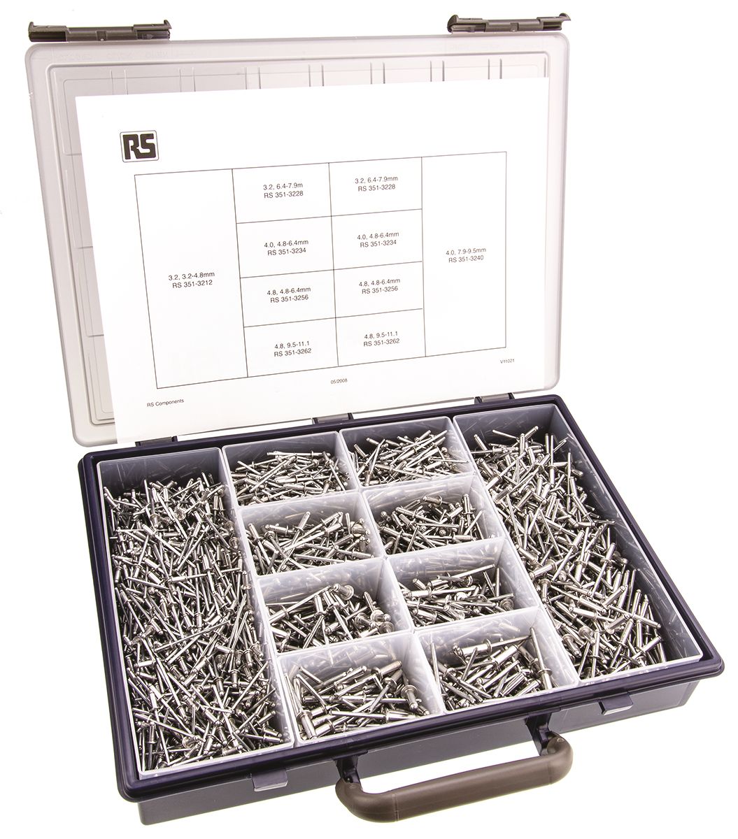 This is 1600 piece Plain Steel Blind Rivet Set 3.2 → 4.8mm diameter 3.2 → 11.1 mm Thickness manufactured by Mapa. The manufacturer part number is RS_529-176. A quality product with a nice plain finish. It has a mandrel made up of steel material . The product has a standard 3.2mm minimum thickness of material . Whereas, the thickness of material maximum is 11.1mm . Round about 4.8mm is the Rivet Diameter Largest of the product . In addition, its rivet body is made up of aluminium material . Approximately, 3.2mm is the Rivet Diameter Smallest of the product . It has a blind type rivet . The product consists of 1600 pieces.
