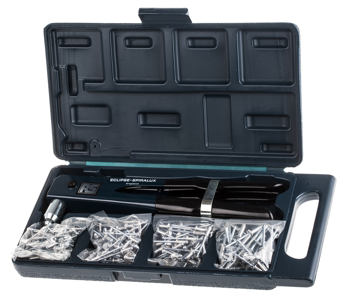 This is 200 piece Plain Rivet Set manufactured by RS Pro. The manufacturer part number is 544-358. It has a Rivet Tool Included yes A quality product with a nice plain finish. It has a mandrel made up of none material . Round about 5mm is the Rivet Diameter Largest of the product . In addition, its rivet body is made up of aluminium material . Approximately, 3mm is the Rivet Diameter Smallest of the product . The product consists of 200 pieces.