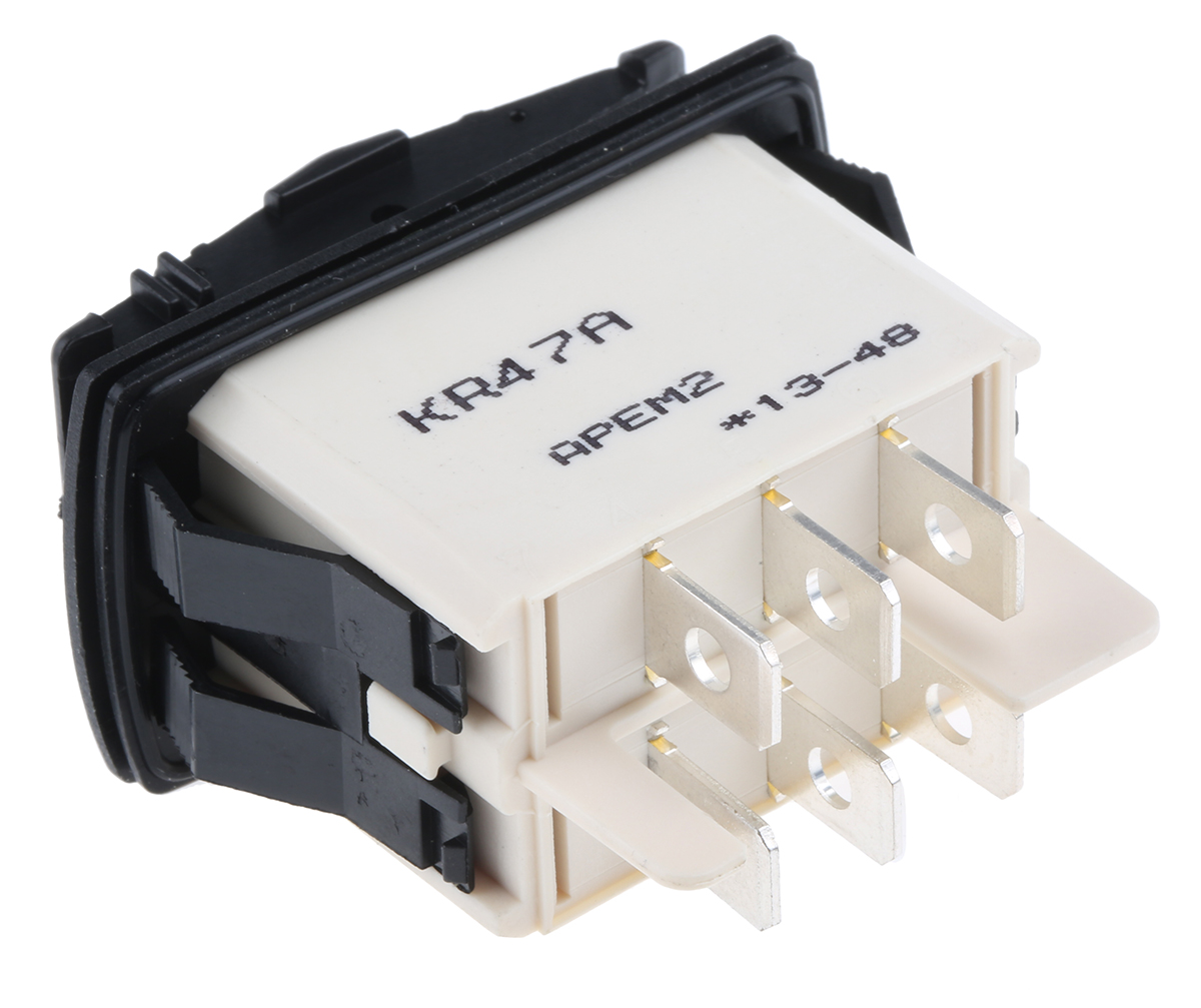 This is DPDT (On)-Off-(On) Rocker Switch Panel manufactured by Apem. The manufacturer part number is KR47CAKXXG. It is designed with an adorable rectangular shape actuator . It has approximately 24v DC voltage rating . Its panel cut out is 36.8mm in height . Illumination Option no. The product is available in panel mount configuration. It is IP rated with ip68. The rated contact current is 5 a. Whereas, the minimum operating temperature of the product is -40°c. The product has -40 → +85°c of operating temperature range. The panel cut out size includes 36.8 x 21.08mm. The contact is equipped with dpdt configuration. The casing is constructed from highly stable nylon 66 material. Its panel cut out is 21.08mm wide . It features a 10mω contact resistance. The product also provide mechanical stability with 150000operations. It provides (on)-off-(on) switch operation. It has a maximum operating temperature of +85°c. The terminal is a quick connect, solder type. The product is made from sturdy silver materials.