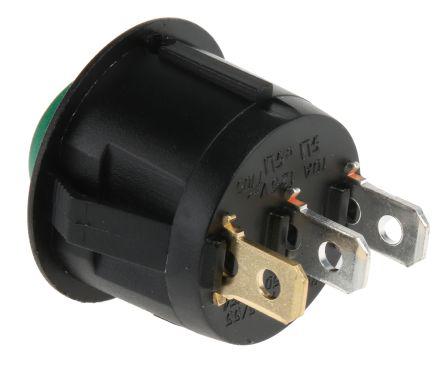 This is RS PRO Illuminated Single Pole Single Throw (SPST) Latching Rocker Switch Panel Mount manufactured by NEUTRAL. The manufacturer part number is ABRR014. It is designed with an adorable round shape actuator . It has approximately 24v DC voltage rating . The actuator has an adorable green colour. Illumination Option yes. The product is available in panel mount configuration. It features a 30mω contact resistance. The rated contact current is 10 a @ 24 v dc. The panel has a 19.4mm cut-out diameter. The product has -25 → +125°c of operating temperature range. The panel cut out size includes 19.4 (dia.)mm. The contact is equipped with single pole single throw (spst) configuration. The casing is constructed from highly stable nylon material. Whereas, the minimum operating temperature of the product is -25°c. The product also provide mechanical stability with 10000cycles. It provides latching switch operation. It has a maximum operating temperature of +125°c. The product is made from sturdy silver nickel alloy materials.