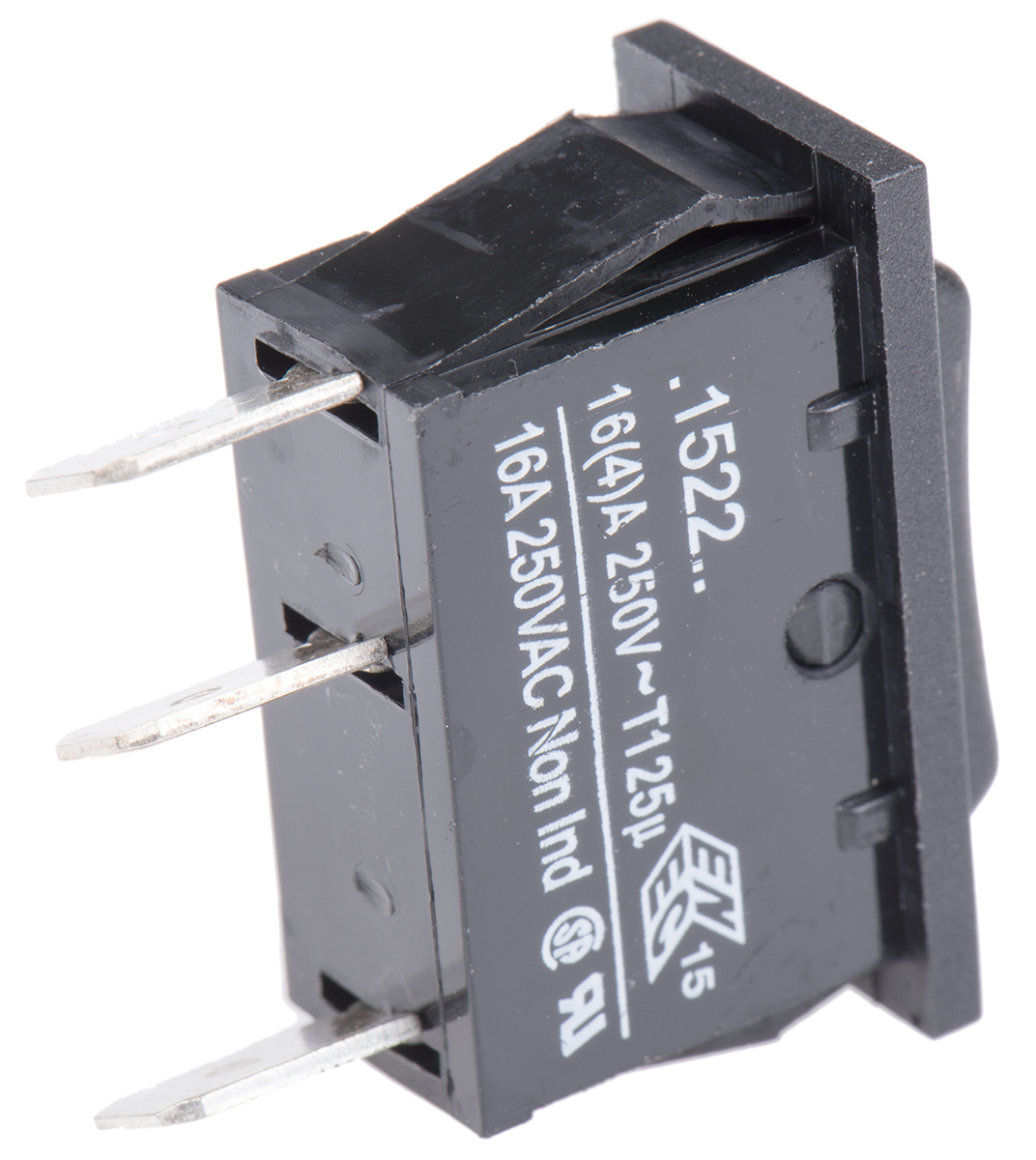 This is Single Pole Double Throw (SPDT) (On)-Off-(On) Rocker Switch Panel Mount manufactured by Arcolectric (Bulgin) Ltd. The manufacturer part number is C1522AAAAA. It is designed with an adorable rectangular shape actuator . Its panel cut out is 27.2mm in height . The actuator has an adorable black colour. Illumination Option no. The product is available in panel mount configuration. The rated contact current is 16 a. The contact is equipped with spdt configuration. Its panel cut out is 12.2mm wide . In addition, its AC voltage rating is 125 v, 250v . The panel cut out size includes 27.2 x 12.2mm. The terminal is a quick connect type. It provides (on)-off-(on) switch operation.