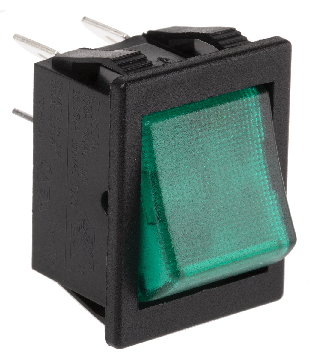 This is Illuminated Double Pole Single Throw (DPST) On-Off Rocker Switch Panel Mount manufactured by Arcolectric (Bulgin) Ltd. The manufacturer part number is C1353ALNAF. It is designed with an adorable rectangular shape actuator . Its panel cut out is 30mm in height . The actuator has an adorable green colour. Illumination Option yes. The product is available in panel mount configuration. It includes on (symbol); off (symbol) legend text . The rated contact current is 16 a. The product 1350, is a highly preferred choice for users. The contact is equipped with dpst configuration. It has a white (symbol) colour legend text . Its panel cut out is 22mm wide . In addition, its AC voltage rating is 125 v, 250v . The panel cut out size includes 30 x 22mm. The terminal is a quick connect type. It provides on-off switch operation.