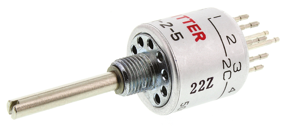 This is Rotary Switch 5 Way Solder manufactured by KNITTER-SWITCH. The manufacturer part number is MR 2 -5. The product includes 5 switch positions . Its diameter is 6.5mm. The given dimensions of the product include 6.5 x 40.8mm. The product is available in panel mount configuration. Moreover, the product has a nominal 125 v ac, 24v dc voltage rating. The rated contact current is 500 ma @ 24 v dc. The contact is equipped with dp5t configuration. In addition, the height is 40.8mm. Applications Information involves test and instrumentation switches. The casing is constructed from highly stable aluminium material. Whereas, the minimum operating temperature of the product is -45°c. The product contains 2 contacts. It has a maximum operating temperature of +110°c. The terminal is a solder type. The product is made from sturdy silver materials.