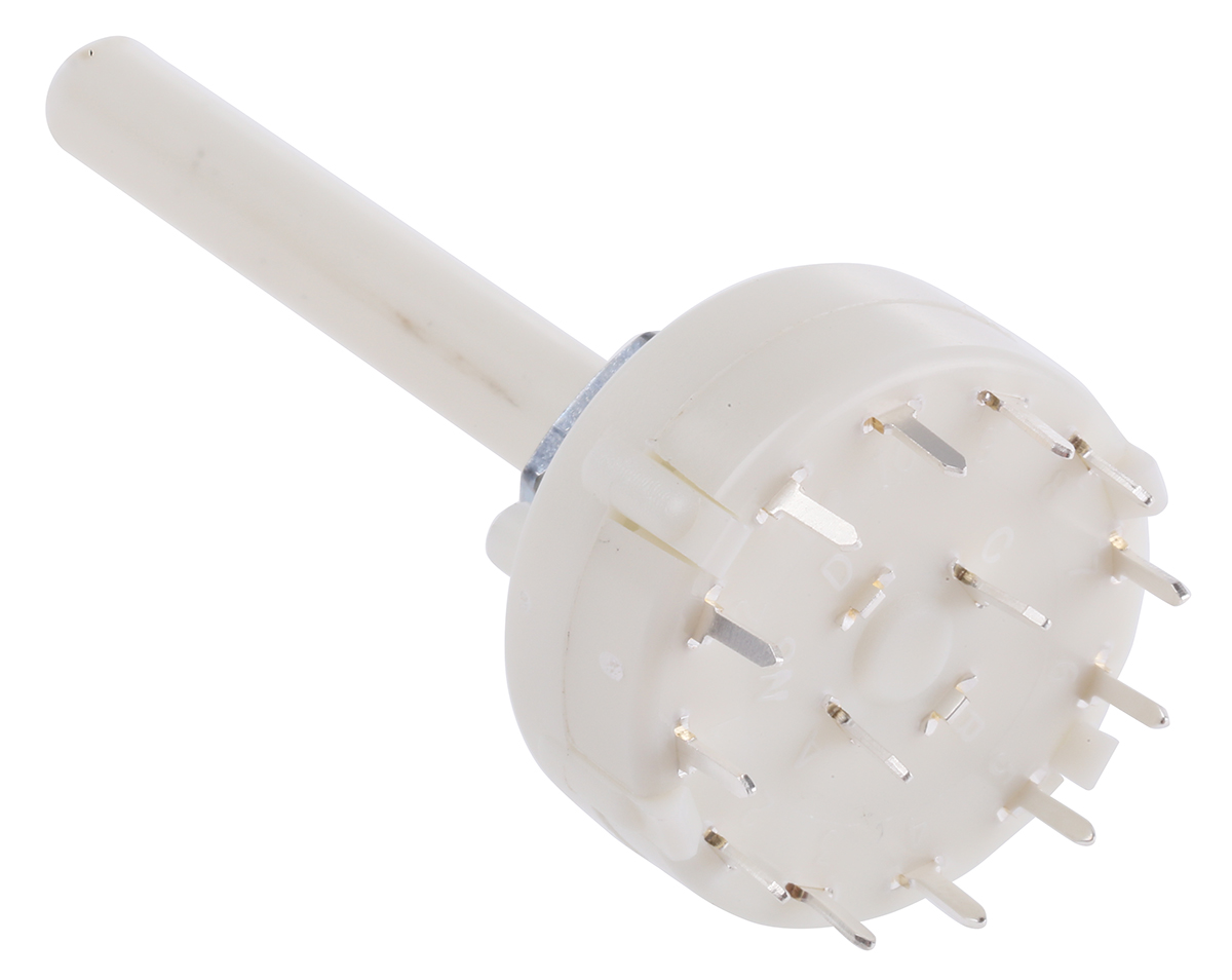 This is Rotary Switch 6 Way 1.5 (PCB) mm 10 (Panel) mm Solder IP65 manufactured by Lorlin. The manufacturer part number is CKF1050. The product includes 6 switch positions . Its diameter is 27.5mm. The given dimensions of the product include 27.5 x 64.1mm. The product is available in pcb configuration. It includes 1-12 legend text . The rated contact current is 150 ma @ 250 v ac. Moreover, the product has a nominal 250v ac/dc voltage rating. It is IP rated with ip65. In addition, It features 1.5 (pcb) mm, 10 (panel) mm of mounting hole size. It has a white colour legend text . In addition, the height is 64.1mm. The casing is constructed from highly stable nylon 66 material. Whereas, the minimum operating temperature of the product is -30°c. The contact is equipped with dp6t configuration. The product also provide mechanical stability with 10000operations. The product contains 2 contacts. It has a maximum operating temperature of +85°c. The terminal is a solder type. The product is made from sturdy silver plated brass materials.
