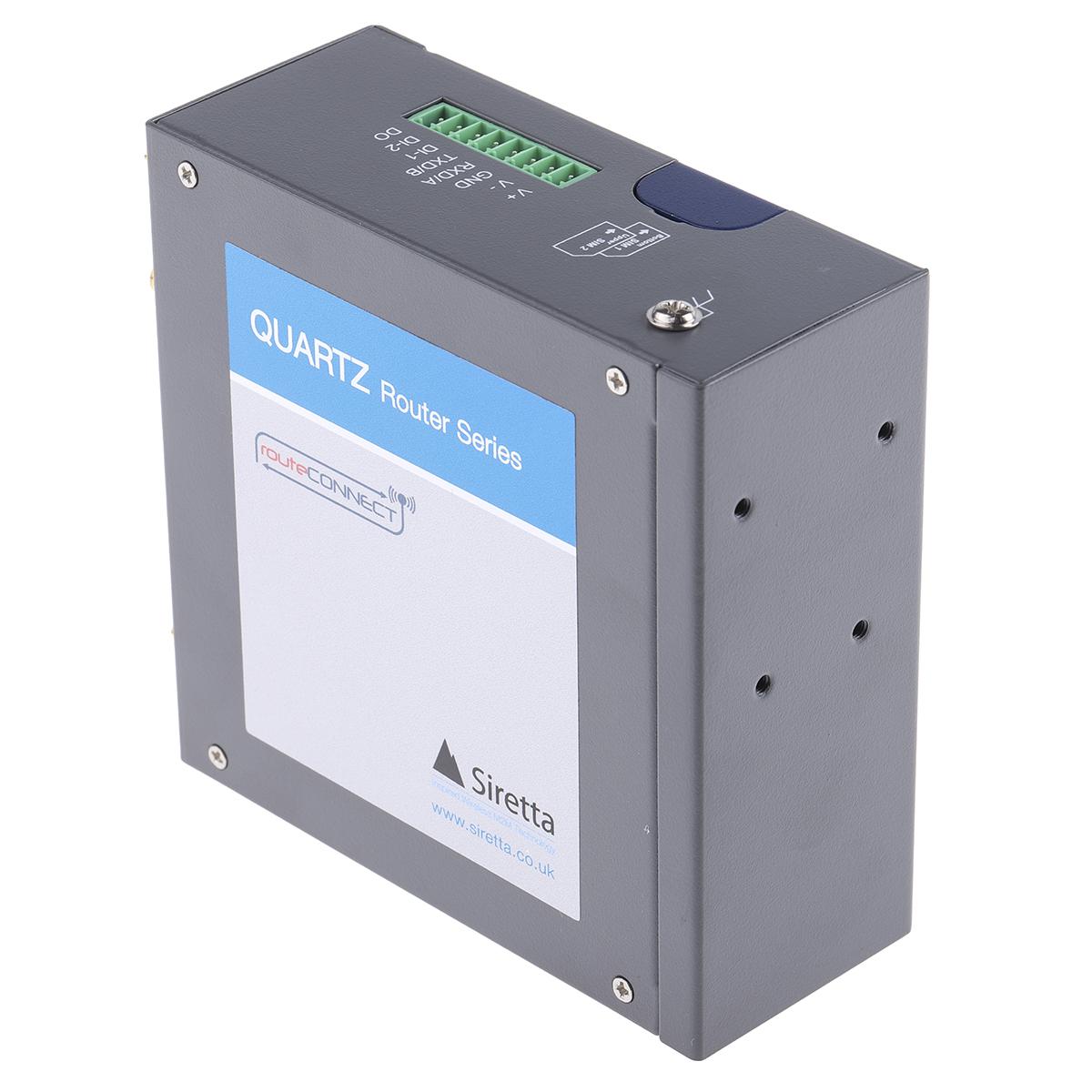This is 2G 3G 4G Router I/O LAN RS-232 SIM Connection 1 x RS-232 2 x LAN 2 x SIM 3 x I/O ports 150Mbit/s manufactured by Siretta. The manufacturer part number is QUARTZ-W22-LTE(EU)+ACC. It has a standard 0.9 ghz, 2.1ghz WiFi band . Its wireless data rate is about 150mbit/s . The given dimensions of the product include 42 x 102 x 100mm. The typical product's weight is 300g. It has a modem router . In addition, the height is 100mm. Moreover, it is built with a/an 4g lte wireless connectivity . Furthermore, the product is 42mm wide. The product comes in 102mm depth. It has a model quartz-w22-lte(eu)+acc. It is designed with 150mbit/s of network speed . It created with 802.11 b/g/n WiFi standard .