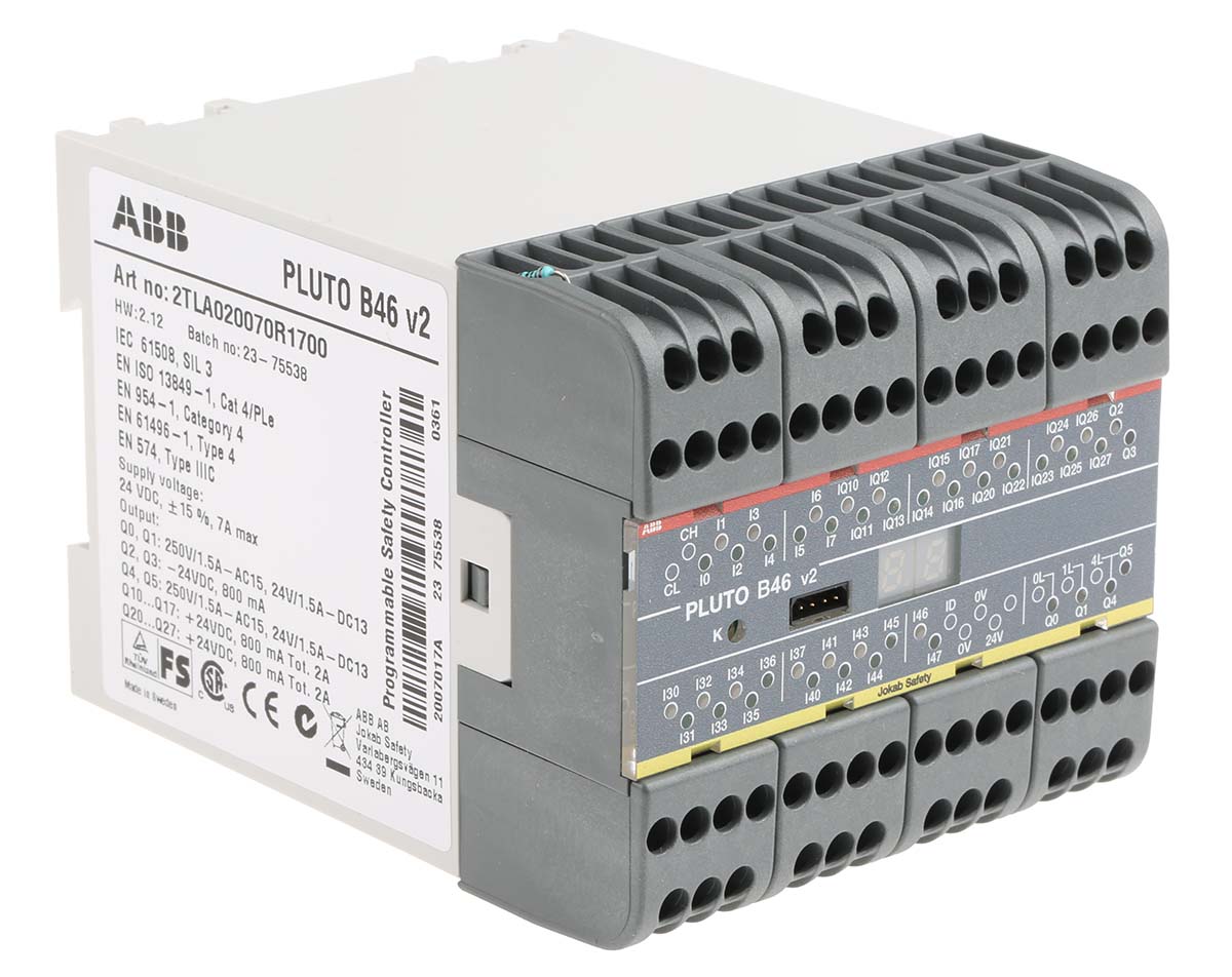 This is Pluto 2TLA Series Safety Controller 24 Safety Inputs 6 Safety Outputs 24 V dc manufactured by ABB. The manufacturer part number is 2TLA020070R1700 Pluto B46 v2. It provides robust safety and is complied with 4 safety category. Moreover, it has 6 safety outputs . The given dimensions of the product include 84 x 90 x 118 mm. It is IP rated with ip20, ip40. The rated contact current is 1.5 a. The product 2tla, is a highly preferred choice for users. 46 is the I/O value of the product. Its accurate length is 84mm. Including 24 safety inputs . Furthermore, the product is 90mm wide. The product comes in 118mm depth. Features 24 v dc supply voltage. It features pluto range. The integrated contact has 250 v ac, 50 v dc of voltage rating. Additionally, it has sil 3 SIL .