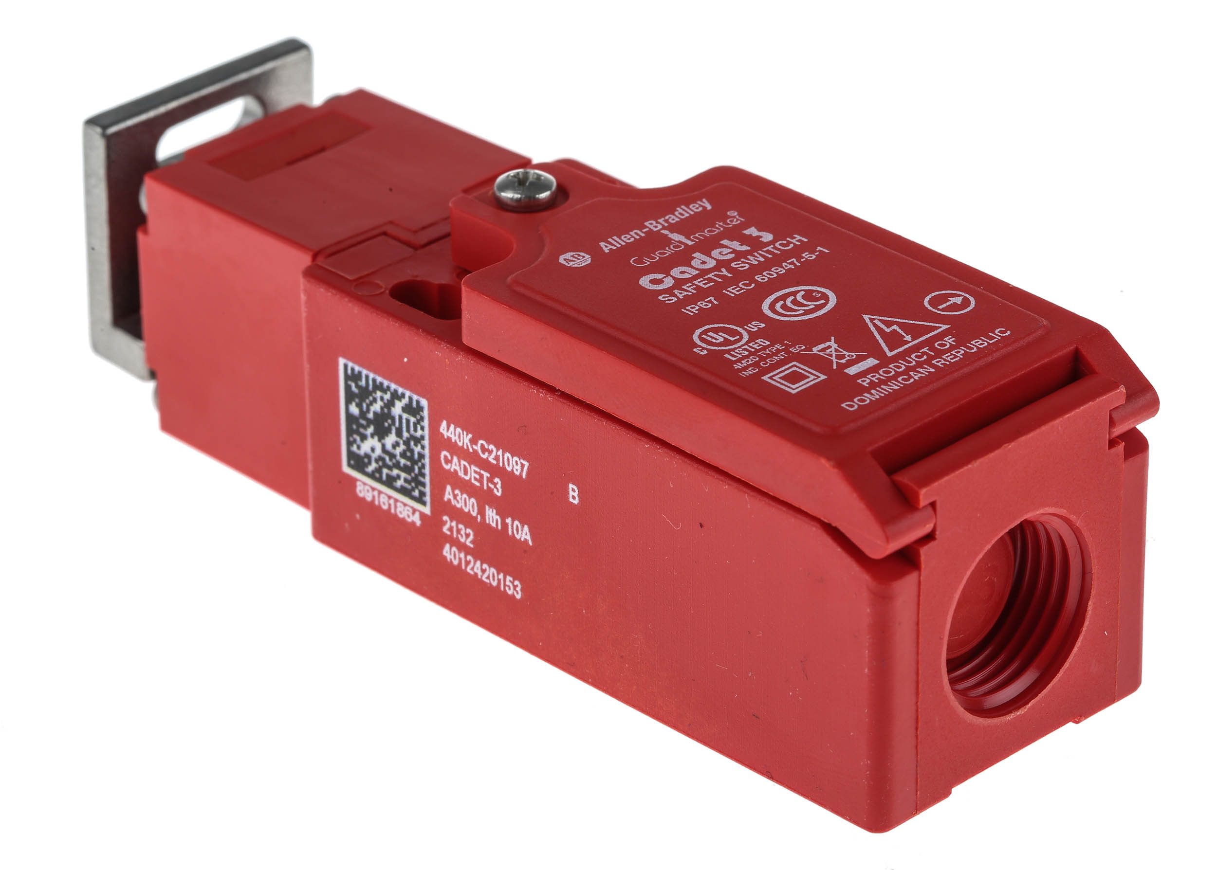 The Allen Bradley Guardmaster 440K-C21097 is a high-performance safety interlock switch designed to enhance machine safety in industrial environments. Part of the Cadet 3 series, this switch features a robust glass-filled PBT housing and offers a 90° actuator with 8 possible head orientations, providing versatile installation options. With a 3NC (Normally Closed) contact configuration and a maximum current rating of 6A, it ensures reliable operation under demanding conditions. The switch is IP67 rated, making it suitable for harsh environments, and supports M16 conduit connections for secure wiring. Operating within a temperature range of -20°C to +80°C, it delivers consistent performance across various industrial applications.