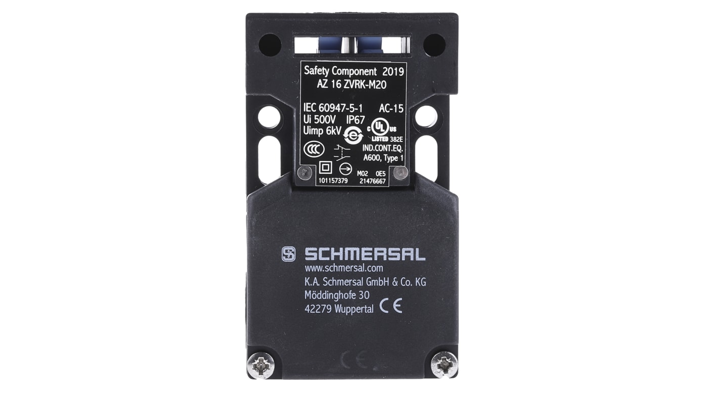 This is AZ16 Safety Interlock Switch Fibreglass 1NC/1NO manufactured by Schmersal. The manufacturer part number is AZ16ZVRK-M20. It has 24v maximum DC voltage. A bespoke product carries 230v of maximum AC voltage. The normal state configuration includes 1nc/1no. It also carries 4a maximum current. It is IP rated with ip67. It has a keyed style lock . The product az16, is a highly preferred choice for users. Its accurate length is 90mm. It contains 3 head directions . The product also features robust glass fibre reinforced thermoplastic housing material. Furthermore, the product is 52mm wide. The product comes in 30mm depth. It includes nc safety contacts . It has 1no high-quality auxiliary contact . It has a maximum operating temperature of +80°c. Whereas, the minimum operating temperature of the product is -30°c. It allows m20 connection type.