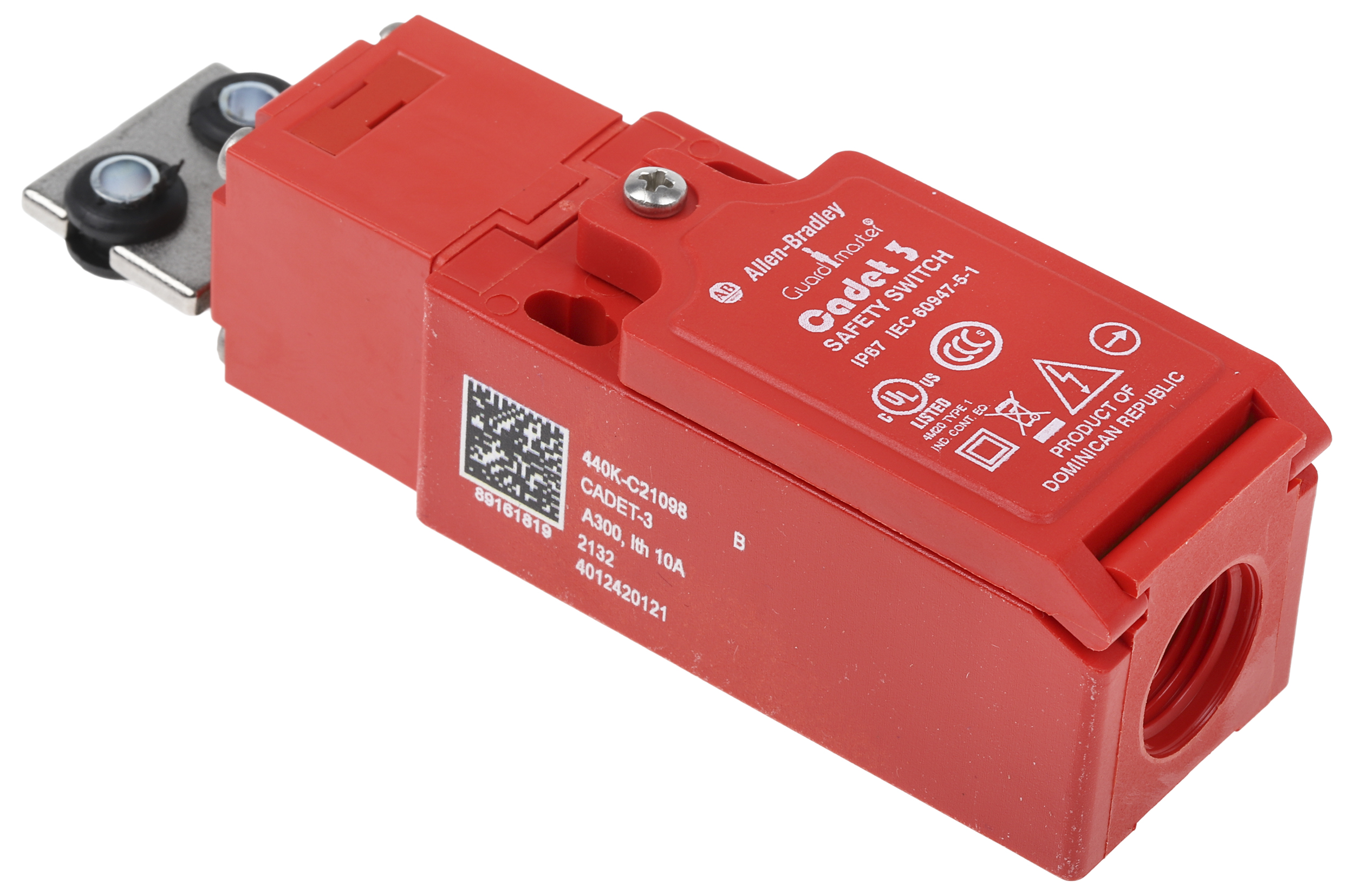 This is 440K Safety Interlock Switch Fibreglass 2NC/1NO manufactured by Allen Bradley Guardmaster. The manufacturer part number is 440K-C21098. It has 600v maximum DC voltage. A bespoke product carries 600v of maximum AC voltage. It includes 2nc safety contacts . It also carries 2.2 a, 6a maximum current. It is IP rated with ip67. It has a keyed style lock . The product 440k, is a highly preferred choice for users. The normal state configuration includes 2nc/1no. Its accurate length is 90.5mm. It includes an actuator yes . It contains 8 head directions . The product also features robust glass filled pbt housing material. Furthermore, the product is 31mm wide. The product comes in 30.4mm depth. Additionally, it has a/an interlock type lock . It features cadet 3 range. It has 1no high-quality auxiliary contact . It has a maximum operating temperature of +80°c. Whereas, the minimum operating temperature of the product is -20°c. It allows m16 connection type.