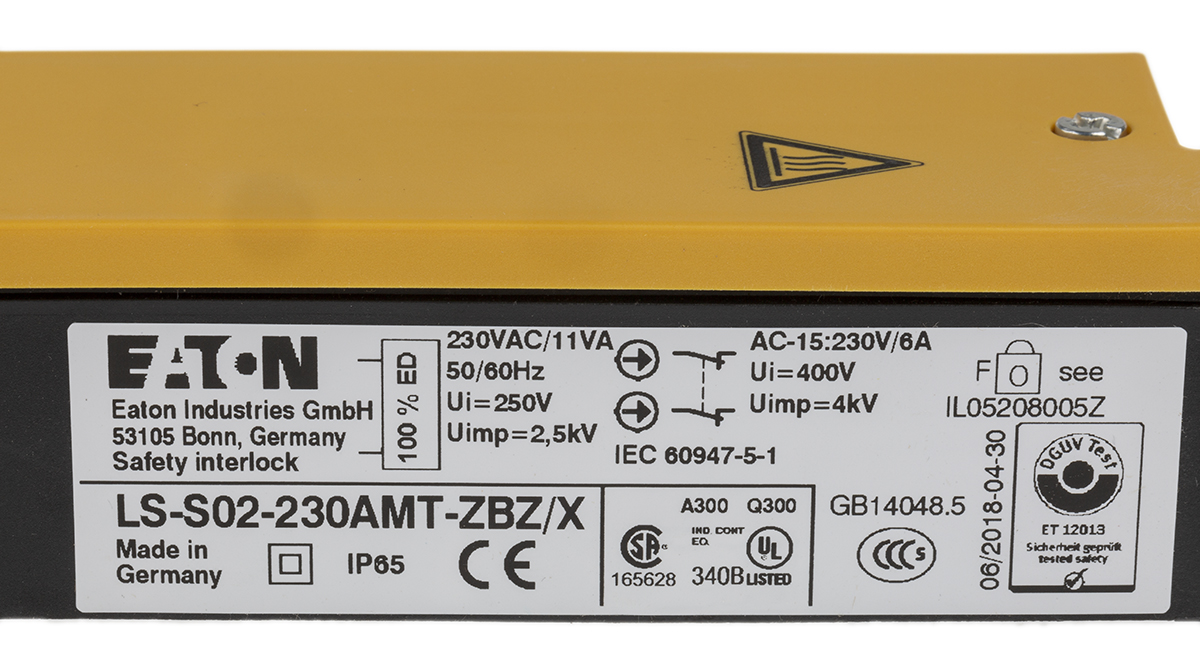This is LS ZBZ/X Safety Interlock Switch 2NC Magnet Lock manufactured by Eaton. The manufacturer part number is 106822 LS-S02-230AMT-ZBZ/X. It has 220v maximum DC voltage. A bespoke product carries 415v of maximum AC voltage. It includes 2nc safety contacts . It is IP rated with ip65 ip66. Its accurate length is 60mm. It includes an actuator no . It contains 1 head directions . Furthermore, the product is 173mm wide. The product comes in 30.8mm depth. Additionally, it has a/an magnet lock type lock . The normal state configuration includes 2nc. It has a maximum operating temperature of +40°c. Whereas, the minimum operating temperature of the product is -25°c. It allows m20 connection type.