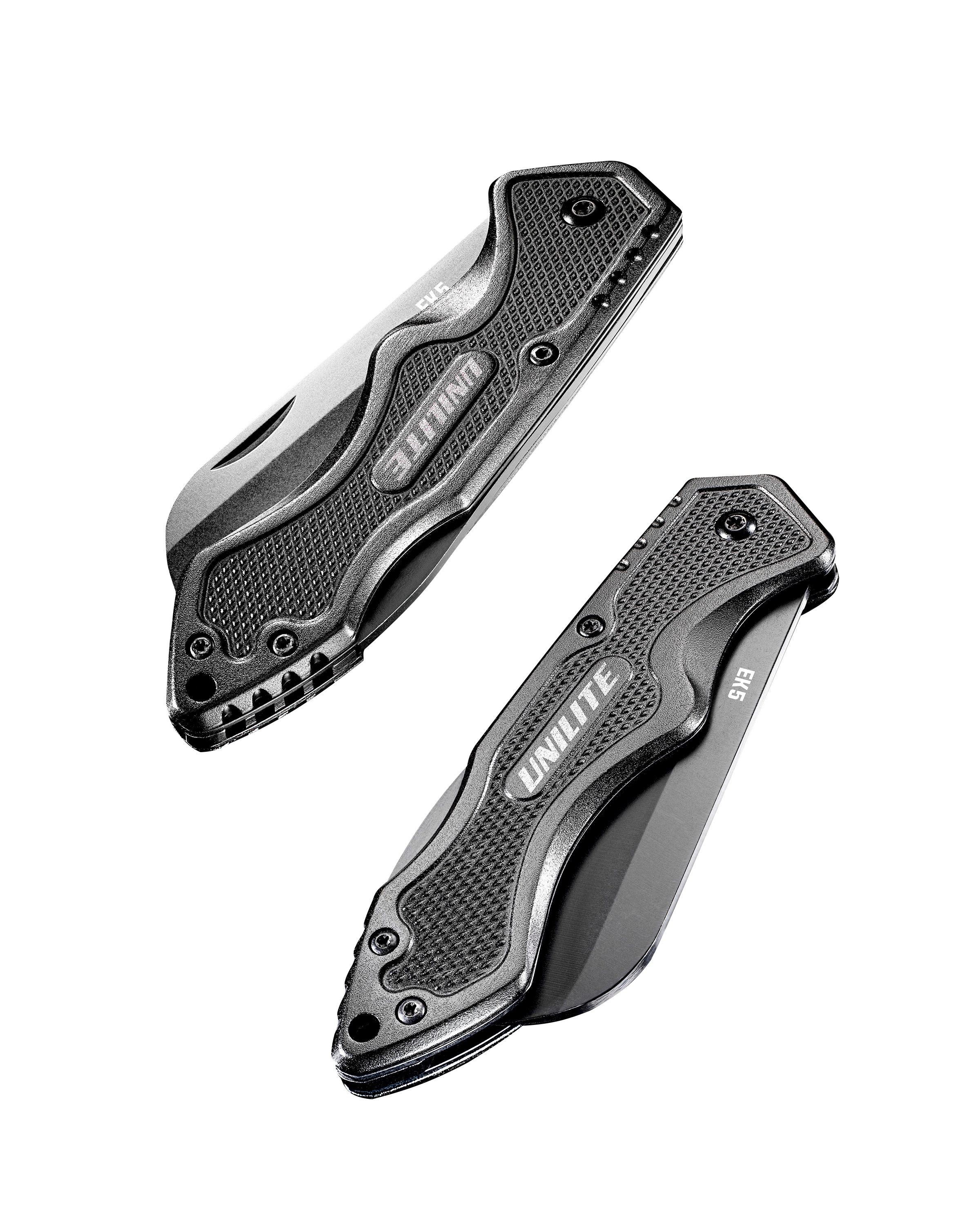 The Unilite Utility Knife is a heavy duty folding knife with a super high-carbon 7Cr17MoV stainless steel blade with high tensile strength. It has Sharpening choil notch at the blade plunge line for easier sharpening. It has Super low-profile at only 10mm thick. Durable and easy to operate Lock back mechanism Ultra tough ergonomic aluminium handle