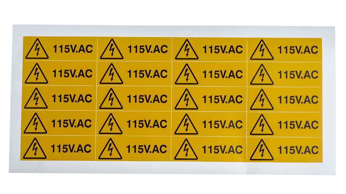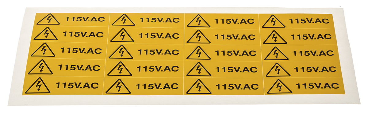 This is Electricity Danger Sign with English Text Vinyl 60 x 20mm Hazard Warning Label manufactured by RS Pro. The manufacturer part number is 776-0970. Its text message shows 115v ac . Additionally, it is self-adhesive yes . It has a decent black/yellow colour. The product is made from highly stable and reliable vinyl. In addition, the height is 20 mm. Furthermore, the product is 60mm wide. However, its text language is english . In addition, it displays electricity danger sign description .