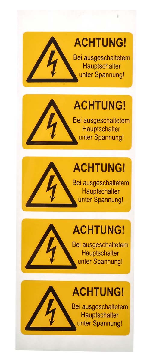 This is with German Text PVC 5 Hazard Warning manufactured by Idento. The manufacturer part number is ESSW40052. Its text message shows achtung! bei ausgeschaltetem hauptschalter unter spannung . Additionally, it is self-adhesive yes . It has a decent yellow colour. The product is made from highly stable and reliable pvc. It contains 5 item per package . However, its text language is german . In addition, it displays electricity danger sign description .