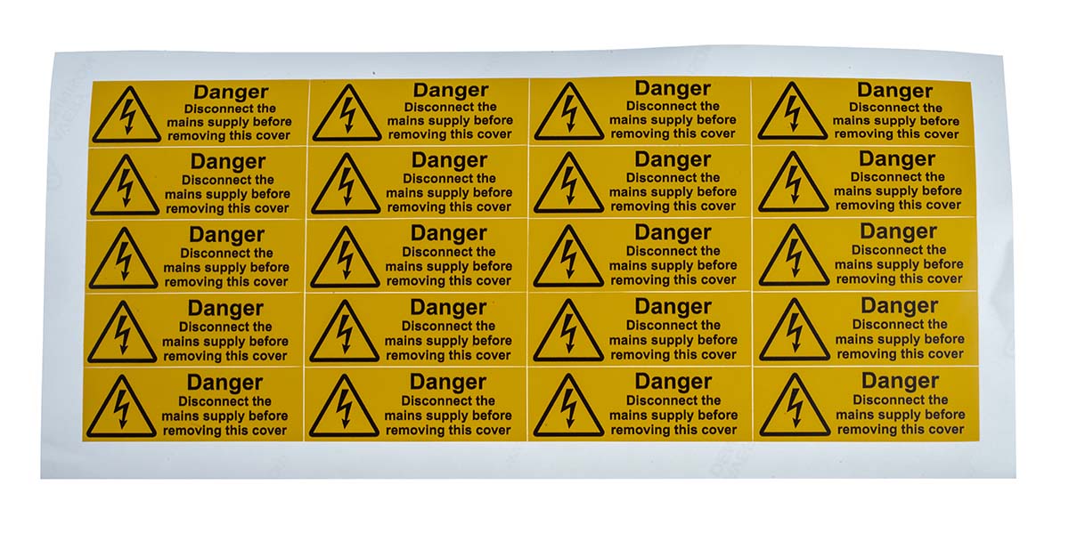 This is Electricity Danger Sign with English Text Vinyl 60 x 20mm Hazard Warning Label manufactured by RS Pro. The manufacturer part number is 776-0932. Its text message shows danger disconnect the mains supply before removing this cover . Additionally, it is self-adhesive yes . It has a decent black/yellow colour. The product is made from highly stable and reliable vinyl. In addition, the height is 20 mm. Furthermore, the product is 60mm wide. However, its text language is english . In addition, it displays electricity danger sign description .