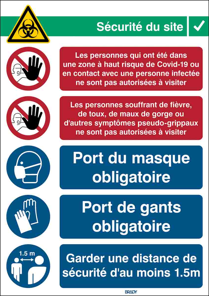 This is Safety Wall Chart Polypropylene B-7527 French 371 mm 262mm manufactured by Brady. The manufacturer part number is COVID-19-REC2-PP-FR. Additionally, it is self-adhesive no . The product is made from highly stable and reliable polypropylene b-7527. In addition, the height is 371 mm. Furthermore, the product is 262mm wide. However, its text language is french . It comes in wall chart configuration.