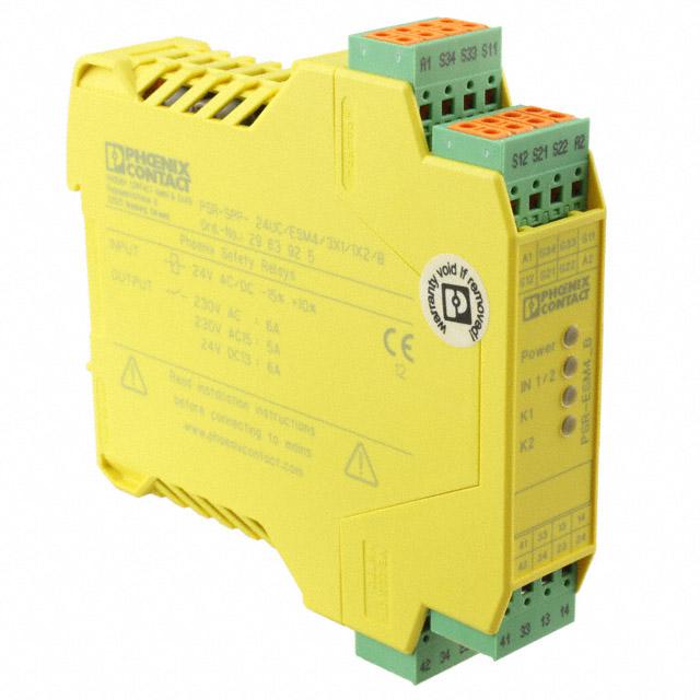 This is manufactured by Phoenix Contact. The manufacturer part number is 2963925. It includes 3 safety contacts . It is supplied with 2 channels. Features 24v supply voltage. It is assigned with possible HTSUS value of 8536.49.0050. The product is rohs3 compliant. The coil voltage of the product is 24vac/dc. Moreover, it has spring terminal terminal style. The product has -20°c ~ 55°c operating temperature range. It has a coil current of 140 ma. The product's switching voltage is 250vac, 250vdc - max. In addition, it is reach affected. It is shipped in bulk package . It also has a 3pst-no (3 form a) contact form. Its typical moisture sensitivity level is 1 (unlimited). The operating time of the product is 20 ms. It has a long 8 weeks standard lead time. It has a contact current rating of 6 a. The product is available in din rail configuration. The product psr, is a highly preferred choice for users. While 45 ms is its release time. The product is designated with the ear99 code number. The product is made from sturdy silver tin oxide (agsno), gold (au) materials.
