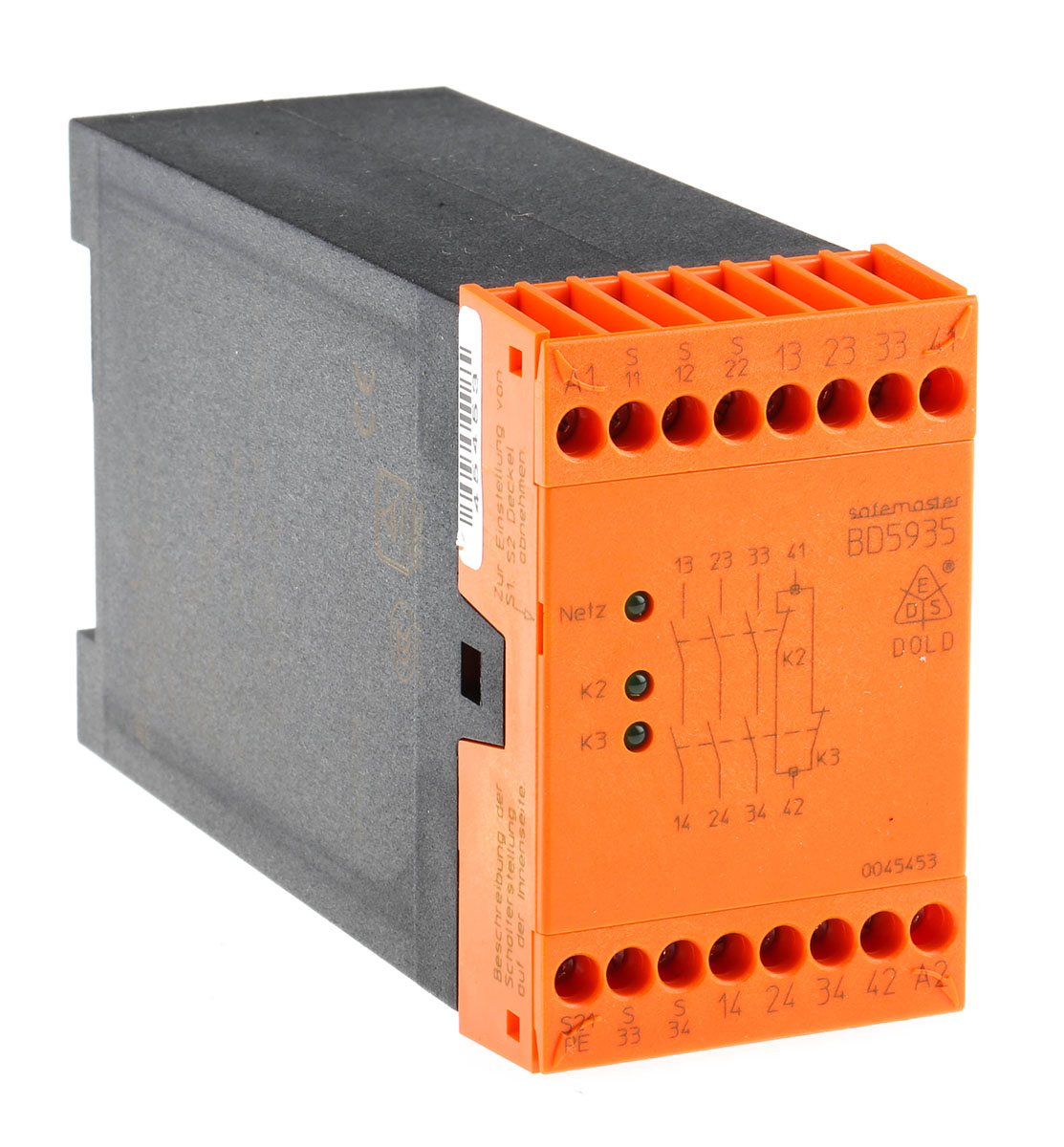 This is BD 5935 230 V ac Safety Relay Dual Channel with 3 Safety Contacts and 1 Auxilary Contact manufactured by Dold. The manufacturer part number is BD5935.48 AC50/60Hz 230V. It performs basic function of emergency stop. It has 3 SIL IEC 61508 safety standard . Moreover, it has a/an monitored reset method . In addition, it has 4 safety category ISO 13849-1 . Moreover, it has e PL ISO 13849-1 . It has 1 high-quality auxiliary contact . The product bd 5935, is a highly preferred choice for users. Its accurate length is 74mm. Furthermore, the product is 45mm wide. The product comes in 121mm depth. It is supplied with 2 channels. Features 230v ac supply voltage. It includes 3 safety contacts . It features safemaster range.