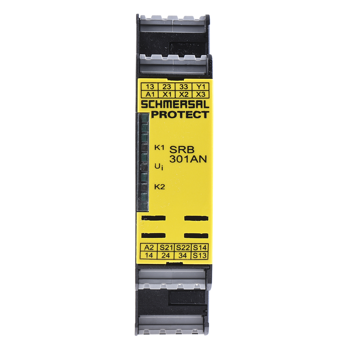 This is SRB 301AN 24 V ac/dc Safety Relay Single or Dual Channel with 4 Safety Contacts manufactured by Schmersal. The manufacturer part number is SRB301AN 24VAC/DC. It performs basic function of light beam/curtain, safety mat/edge, safety switch/interlock. It has 3 SIL IEC 61508 safety standard . Moreover, it has a/an automatic reset method . The product complies with all safety standards, such as iec60947-1. Moreover, it has e PL ISO 13849-1 . It has a/an e performance level . The product srb 301an, is a highly preferred choice for users. Its accurate length is 100mm. Furthermore, the product is 22.5mm wide. The product comes in 121mm depth. It is supplied with 1, 2 channels. Features 24v ac/dc supply voltage. It includes 4 safety contacts . It features protect range. It has 1 high-quality auxiliary contact . The terminal is a screw type. In addition, it has 4 safety category ISO 13849-1 .