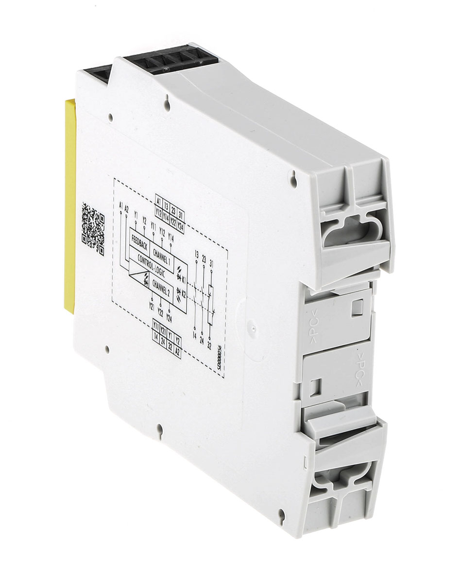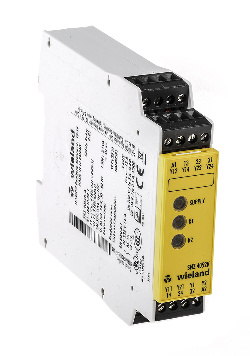 This is SNZ 4052 24 V ac/dc Safety Relay Dual Channel with 2 Safety Contacts and 1 Auxilary Contact manufactured by Wieland. The manufacturer part number is R1.188.0530.1. It performs basic function of two hand control. It has 3 SIL IEC 61508 safety standard . Moreover, it has a/an monitored reset method . It includes 2 safety contacts . Moreover, it has e PL ISO 13849-1 . It has a/an e performance level . The product snz 4052, is a highly preferred choice for users. Its accurate length is 96.5mm. Furthermore, the product is 22.5mm wide. The product comes in 114mm depth. It is supplied with 2 channels. Features 24v ac/dc supply voltage. It features saferelay range. It has 1 high-quality auxiliary contact . The terminal is a screw type. In addition, it has 4 safety category ISO 13849-1 .