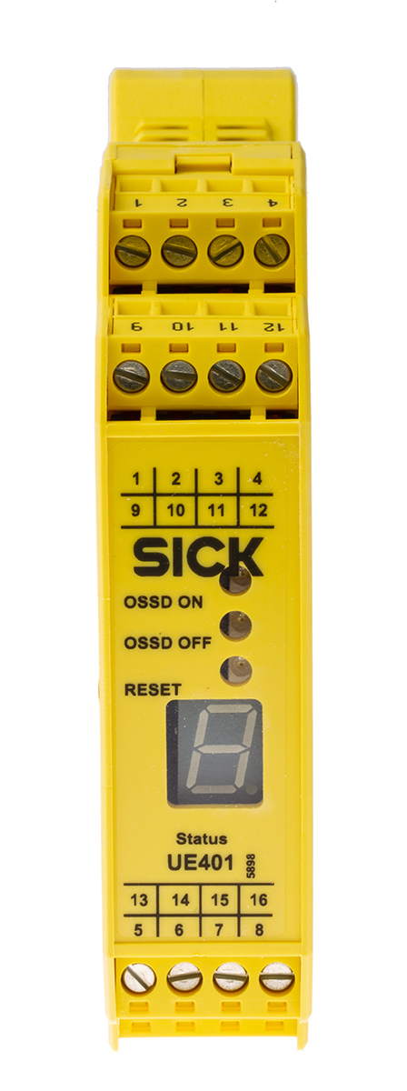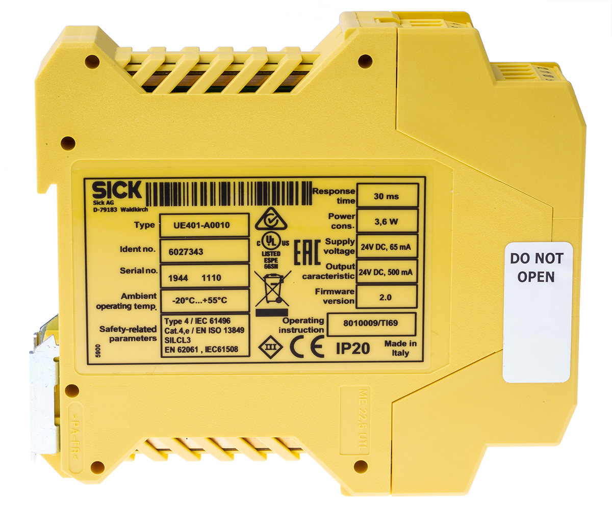 This is UE401 28.8 V dc Safety Relay manufactured by Sick. The manufacturer part number is UE401-A0010. It performs basic function of light beam/curtain. It has 3 SIL IEC 61508 safety standard . In addition, it has 4 safety category ISO 13849-1 . Moreover, it has e PL ISO 13849-1 . It has a/an e performance level . The product ue401, is a highly preferred choice for users. Its accurate length is 66mm. Furthermore, the product is 23mm wide. The product comes in 113.5mm depth. Features 24v dc supply voltage. The terminal is a screw type.