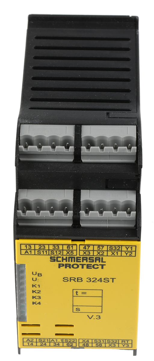 This is SRB 324ST 24 V ac/dc Safety Relay Single or Dual Channel manufactured by Schmersal. The manufacturer part number is SRB324ST 24V (V.3). It performs basic function of light beam/curtain, safety switch/interlock. It has 2 SIL IEC 61508 safety standard . Moreover, it has a/an automatic reset method . In addition, it has 3 safety category ISO 13849-1 . Moreover, it has d PL ISO 13849-1 . It has a/an d performance level . The product srb 324st, is a highly preferred choice for users. Its accurate length is 100mm. Furthermore, the product is 45mm wide. The product comes in 121mm depth. It is supplied with 1, 2 channels. Features 24v ac/dc supply voltage. It includes 5 safety contacts . It features protect range. It has 1 high-quality auxiliary contact . The terminal is a screw type.