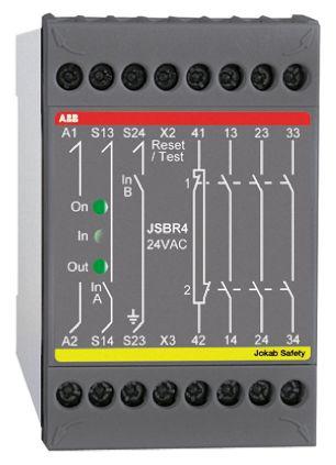 This is JSBR4 24 V ac Safety Relay Dual Channel with 4 Safety Contacts manufactured by ABB. The manufacturer part number is 2TLA010002R0200. It performs basic function of two-hand control. It has 3 SIL IEC 61508 safety standard . In addition, it has 4 safety category ISO 13849-1 . Moreover, it has e PL ISO 13849-1 . The product jsbr4, is a highly preferred choice for users. Its accurate length is 74mm. Furthermore, the product is 45mm wide. The product comes in 120mm depth. It is supplied with 2 channels. Features 24 v ac supply voltage. It includes 4 safety contacts . The terminal is a screw type.