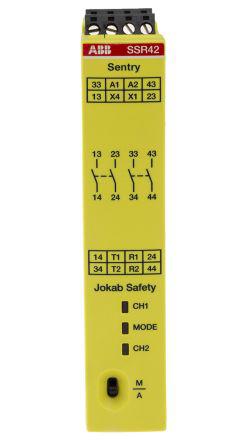 This is SENTRY SSR42 24VDC 2no + 2no delayable manufactured by ABB Jokab. The manufacturer part number is 2TLA010053R0400. It performs basic function of safety switch. Moreover, it has a/an multi-reset reset method . It provides robust safety and is complied with 4 safety category. Its accurate length is 22.5mm. Furthermore, the product is 120mm wide. The product comes in 120mm depth. It is supplied with 3 channels. Features 24 v dc supply voltage. It includes 4 safety contacts . It features sentry range. It has 4 high-quality auxiliary contact . The terminal is a screw type.
