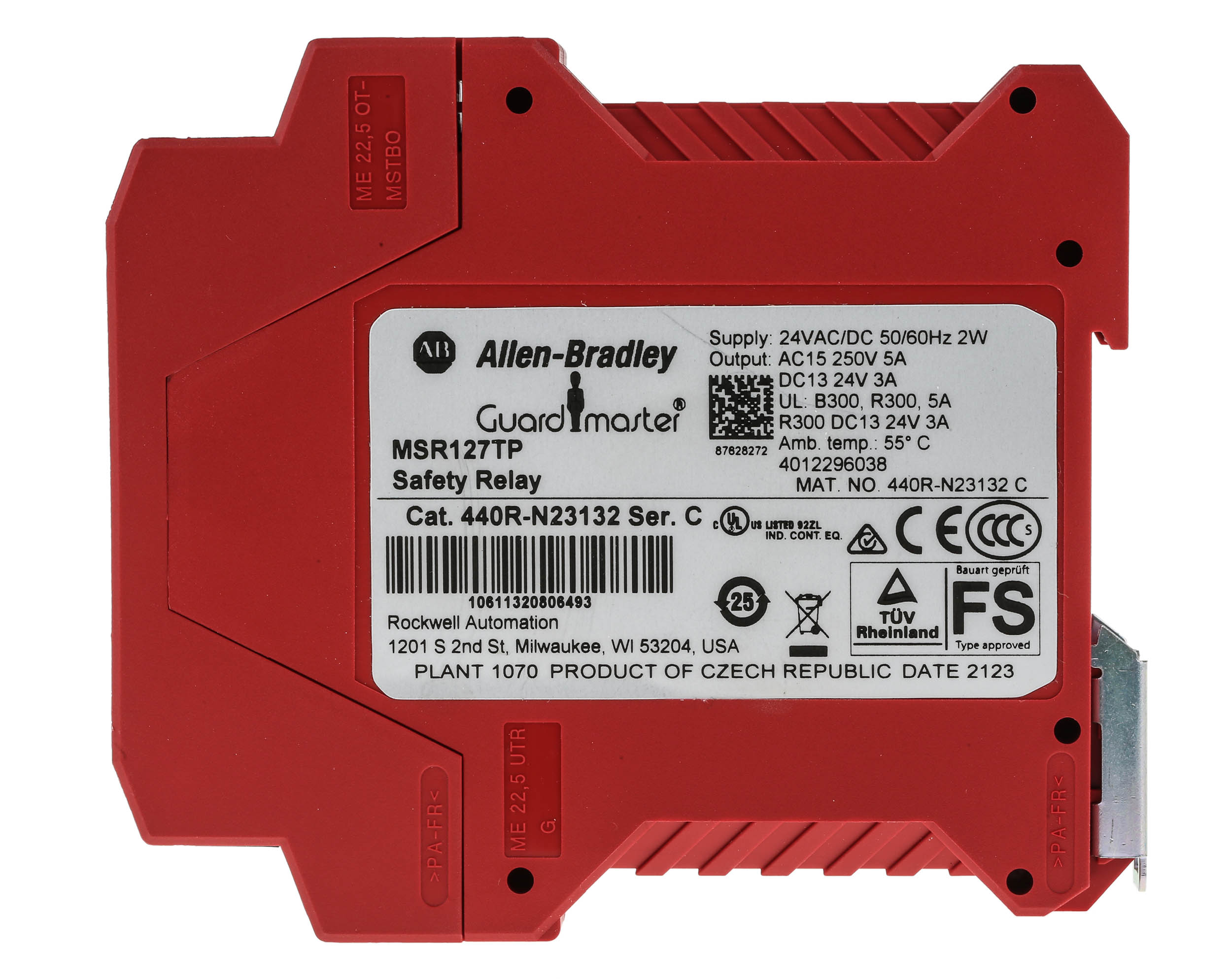 This is Minotaur 24 V ac/dc Safety Relay - Single Channel With 3 Safety Contacts 1 Auxiliary Contact manufactured by Rockwell Automation. The manufacturer part number is 440R-N23132. It performs basic function of light beam/curtain, safety switch/interlock. It has 3 SIL IEC 61508 safety standard . Moreover, it has a/an automatic & manual reset method . In addition, it has 4 safety category ISO 13849-1 . Moreover, it has e PL ISO 13849-1 . It has a/an e performance level . The product msr127tp, is a highly preferred choice for users. Its accurate length is 114.5mm. Furthermore, the product is 99mm wide. The product comes in 22.5mm depth. It is supplied with 1 channels. Features 24v ac/dc supply voltage. It includes 3 safety contacts . It features minotaur range. It has 1 high-quality auxiliary contact . The terminal is a screw type.
