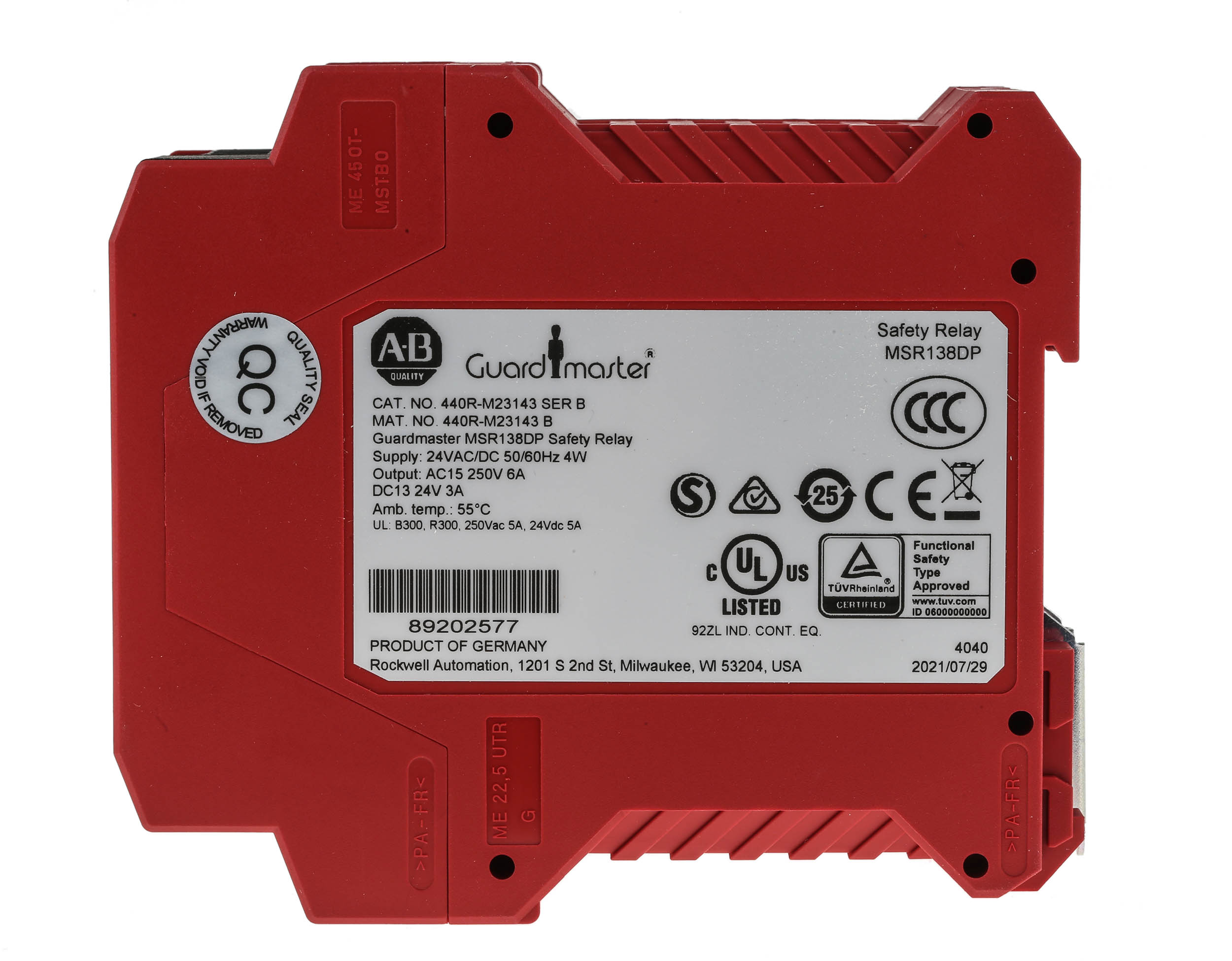 This is Minotaur 24 V ac/dc Safety Relay - With 2 Safety Contacts 1 Auxiliary Contact Automatic Manual manufactured by Rockwell Automation. The manufacturer part number is 440R-M23143. It performs basic function of light beam/curtain, safety switch/interlock. It has 3 SIL IEC 61508 safety standard . Moreover, it has a/an automatic, manual, monitored reset method . In addition, it has 4 safety category ISO 13849-1 . Moreover, it has e PL ISO 13849-1 . It has a/an e performance level . The product msr138dp, is a highly preferred choice for users. Its accurate length is 114.5mm. Furthermore, the product is 99mm wide. The product comes in 45mm depth. Features 24v ac/dc supply voltage. It includes 2 safety contacts . It features minotaur range. It has 1 high-quality auxiliary contact . The terminal is a screw type.