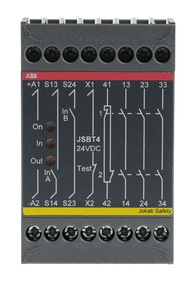 This is 24 V dc Safety Relay - Dual Channel With 3 Safety Contacts 1 Auxiliary Contact Automatic Reset manufactured by ABB. The manufacturer part number is 2TLA010004R0000 JSBT4 24DC. It performs basic function of two hand control. It has 3 SIL IEC 61508 safety standard . Moreover, it has a/an automatic reset method . In addition, it has 4 safety category ISO 13849-1 . Moreover, it has e PL ISO 13849-1 . It has a/an e performance level . The product jsbt4, is a highly preferred choice for users. Its accurate length is 74mm. Furthermore, the product is 45mm wide. The product comes in 120mm depth. It is supplied with 2 channels. Features 24v dc supply voltage. It includes 3 safety contacts . It has 1 high-quality auxiliary contact . The terminal is a screw type.
