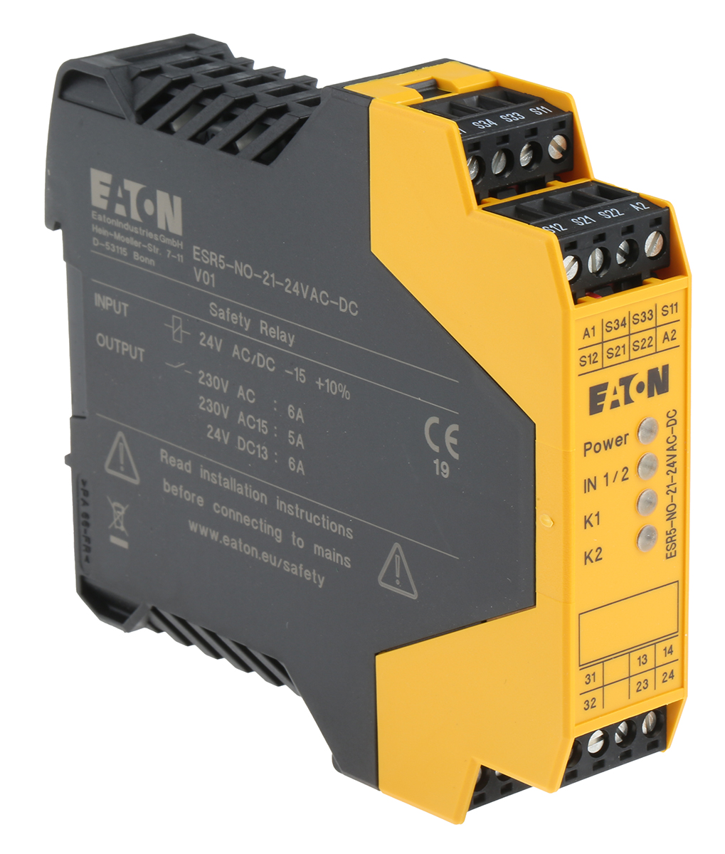 This is ESR5 Safety Relay - Dual Channel With 2 Safety Contacts manufactured by Eaton. The manufacturer part number is 118700 ESR5-NO-21-24VAC-DC. It performs basic function of emergency stop, safety switch/interlock. It has 3 SIL IEC 61508 safety standard . Moreover, it has a/an automatic & manual reset method . The product complies with all safety standards, such as ce, csa, ul. Moreover, it has e PL ISO 13849-1 . It has a/an e performance level . The product eaton moeller, is a highly preferred choice for users. Its accurate length is 22.5mm. Furthermore, the product is 114.5mm wide. The product comes in 99mm depth. It is supplied with 2 channels. Features 24v supply voltage. It includes 2 safety contacts . It features esr5 range. The terminal is a screw type. In addition, it has 4 safety category ISO 13849-1 .