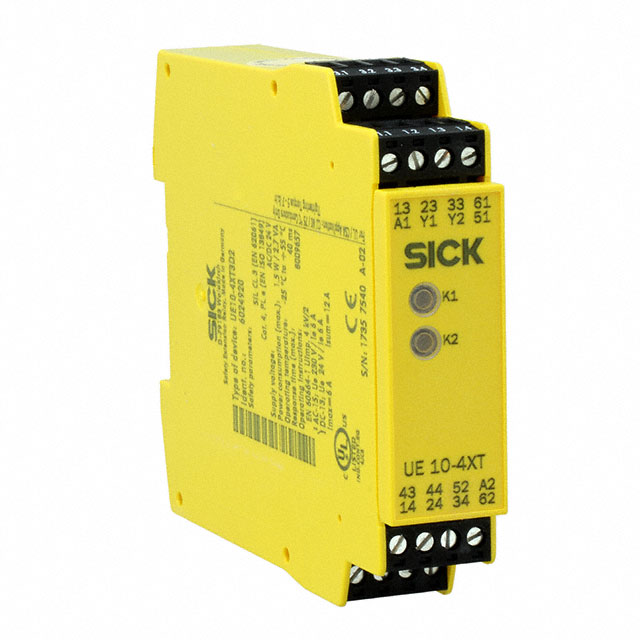 This is manufactured by SICK, Inc.. The manufacturer part number is UE10-4XT3D2. It is assigned with possible HTSUS value of 8536.41.0020. The coil voltage of the product is 24vac/dc. Moreover, it has screw terminal terminal style. The product's switching voltage is 230vac, 300vdc - max. The sick, inc.'s product offers user-desired applications. It also has a 7pst-4no/3nc (4 form a, 3 form b) contact form. Its typical moisture sensitivity level is not applicable. The operating time of the product is 70 ms. It has a contact current rating of 6 a. The product is available in din rail configuration. The product ue10-4xt, is a highly preferred choice for users. In addition, bulk is the available packaging type of the product. The product is designated with the ear99 code number. Moreover, it corresponds to ue10-4, a base product number of the product. The product is made from sturdy silver (ag), gold (au) materials.