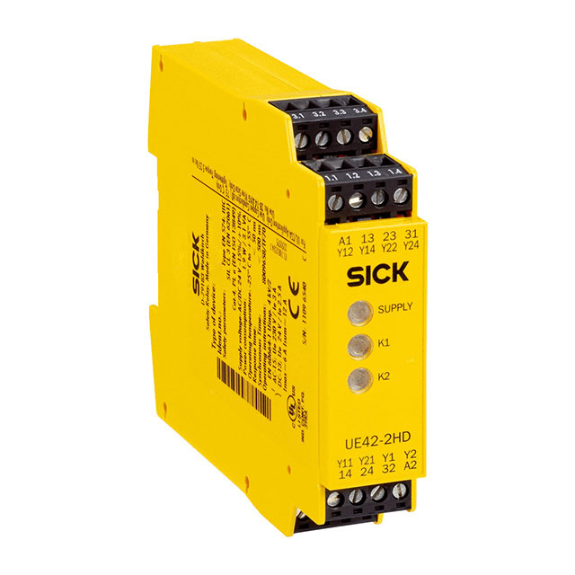 This is manufactured by SICK, Inc.. The manufacturer part number is UE42-2HD2D2. It is assigned with possible HTSUS value of 8536.41.0020. The coil voltage of the product is 24vdc. Moreover, it has screw terminal terminal style. The product's switching voltage is 230vac, 300vdc - max. The sick, inc.'s product offers user-desired applications. It also has a 3pst-2no/1nc (2 form a, 1 form b) contact form. Its typical moisture sensitivity level is not applicable. The operating time of the product is 50 ms. It has a contact current rating of 6 a. The product is available in din rail configuration. The product ue42-2hd, is a highly preferred choice for users. In addition, bulk is the available packaging type of the product. The product is designated with the ear99 code number. Moreover, it corresponds to ue42-2, a base product number of the product. The product is made from sturdy silver (ag), gold (au) materials.