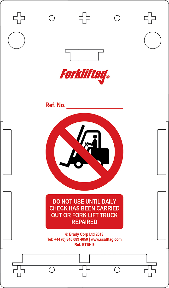 This is Forklift Tag manufactured by Brady. The manufacturer part number is FLT-GB-ETSH-V2-A. This versatile kit contents include 10 forkliftag holders components. It has red on white insert colour . It is offered in english language . It contains 10 item per package . It comes in forklift tag configuration.